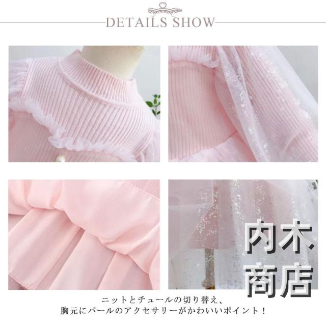 | 身頃は綿生地で、伸縮性が優れ切り替えチュールワンピースです。 秋冬の場合はカーディガン、ジャケットやコートなどとコーディネート、お出かけにもぴったり! ニットとチュールの切り替え、胸元にパールのアクセサリーがかわいいポイント! ワンピースは高級感のあるしっかりとしたツイード生地なので入園式や入学式、結婚式など、大切なシーンやにもご利用いただけます。 | |