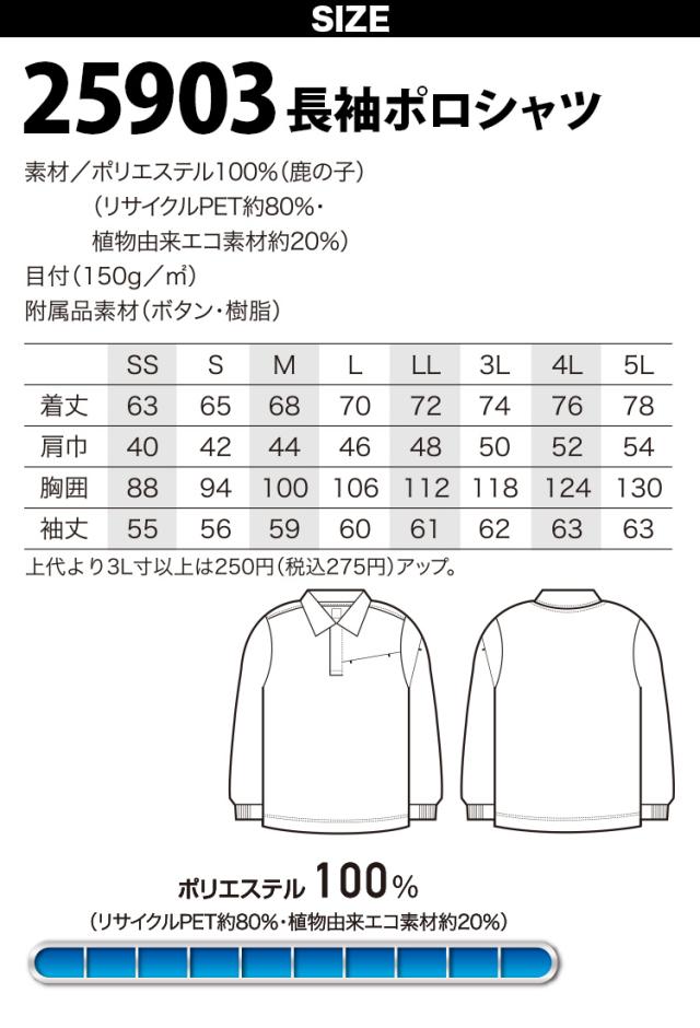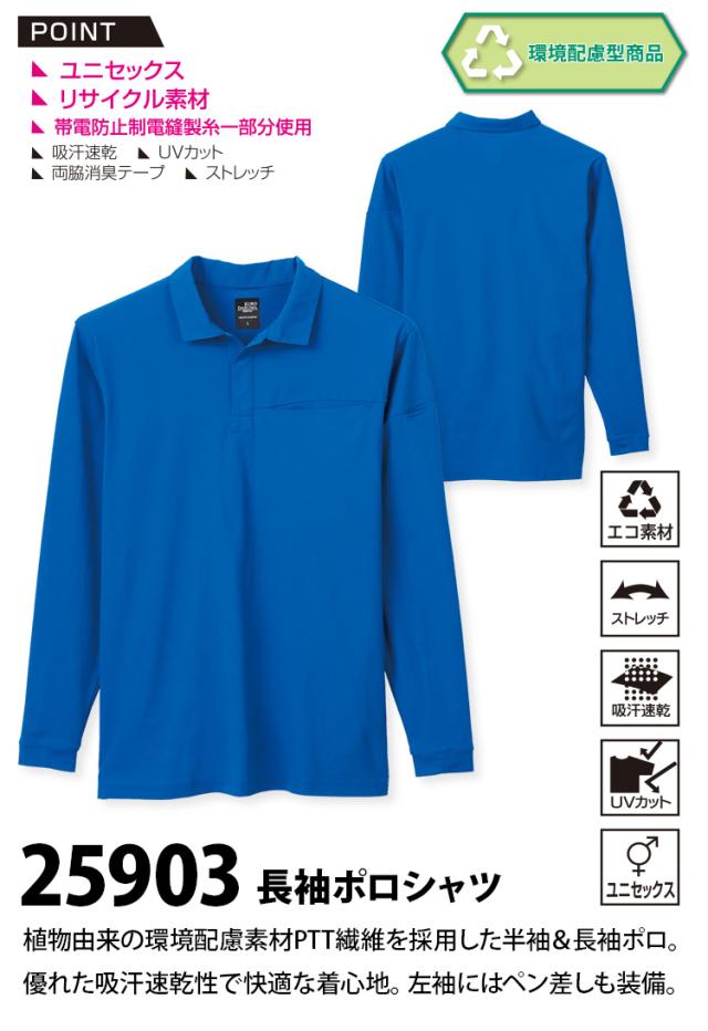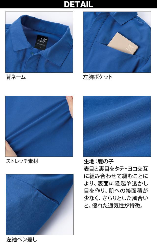 クロダルマ 長袖ポロシャツ 25903 鹿の子 ストレッチ 吸汗速乾 UVカット 左袖ペン差し ユニセックス エコ リサイクル素材 帯電防止制電縫製糸一部分使用 作業服 作業着 KURODARUMA