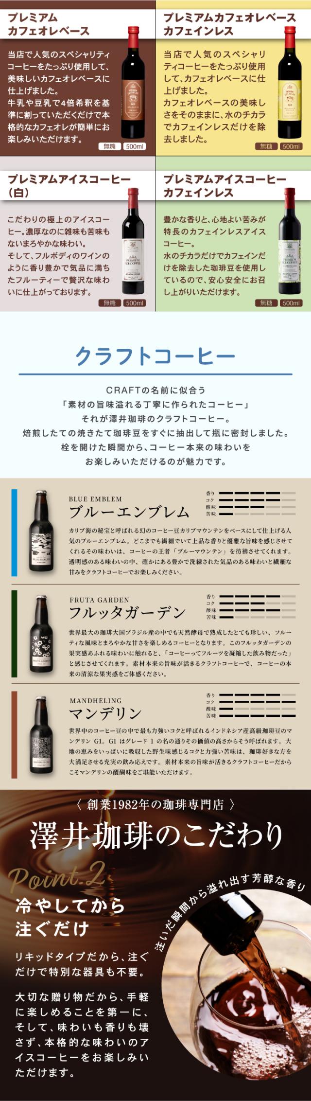 | 栄養成分表示 (100mlあたり) ※推定値 | 【プレミアムアイスコーヒー】エネルギー:4kcal、たんぱく質:0.2g、脂質:0g、炭水化物:0.7g(糖類 0g)、食塩相当量:0.02g 【プレミアムアイスコーヒー カフェインレス】エネルギー:6kcal、たんぱく質:0.3g、脂質:0.2g、炭水化物:0.7g(糖類:0.1g)、食塩相当量:0.02g 【プレミアムカフェオレベース】エネルギー20Kcal、炭水化物2.3g、たんぱく質0g、糖類0.4g、脂質0g、食塩相当量0.0g 【プレミアムカフェオレベース カフェインレス】エネルギー:9kcal、たんぱく質:0.7g、脂質:0.0g、炭水化物:1.6g(糖類 0.0g)、食塩相当量:0.0g 【ブルーエンブレムブレンド】エネルギー:4kcal、たんぱく質:0.2g、脂質:0.1g、炭水化物:0.7g-糖質 0g、食塩相当量:0.1g 【フルッタガーデンブレンド】エネルギー:3kcal、たんぱく質:0.2g、脂質:0g、炭水化物:0.6g-糖質 0g、食塩相当量:0.02g 【マンデリンブレンド】エネルギー:4kcal、たんぱく質:0.3g、脂質:0.1g、炭水化物:0.4g-糖質 0g、食塩相当量:0.03g |