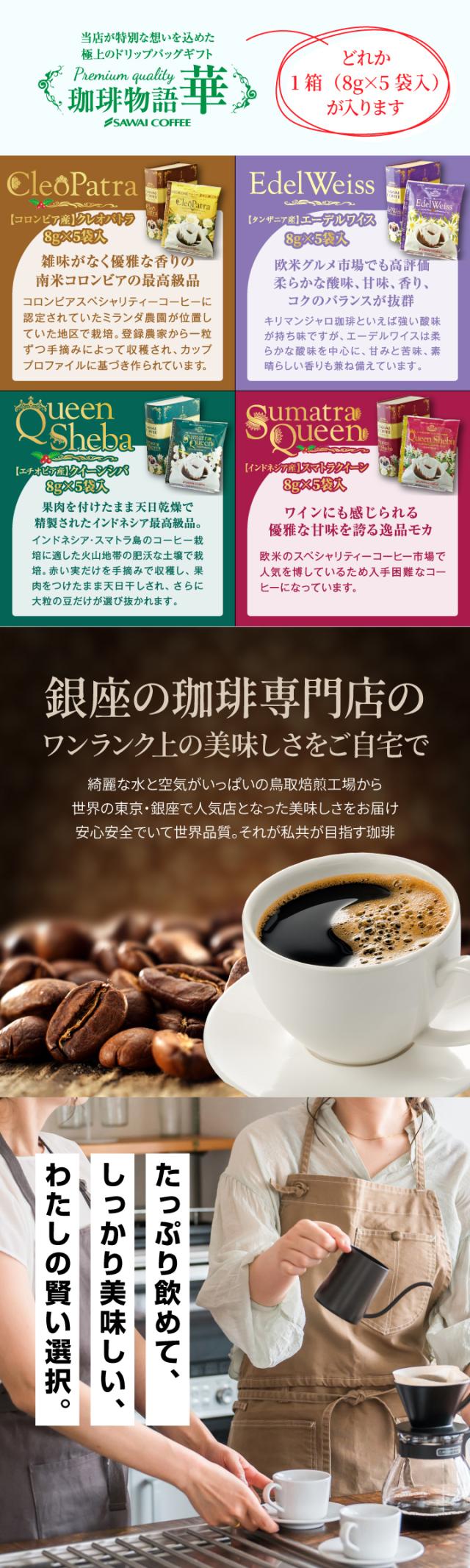 | ドリップバッグコーヒー 産地 | 【クレオパトラ】コロンビア 【エーデルワイス】タンザニア 【クイーンシバ】エチオピア 【スマトラクイーン】インドネシア |