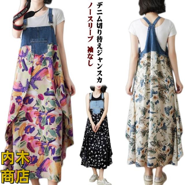 フレアワンピース 袖なし ノースリーブ ジャンパースカート ジャンパースカート シフォンドッキングデニムジャンパースカート シフォン 異素材 切り替え 春