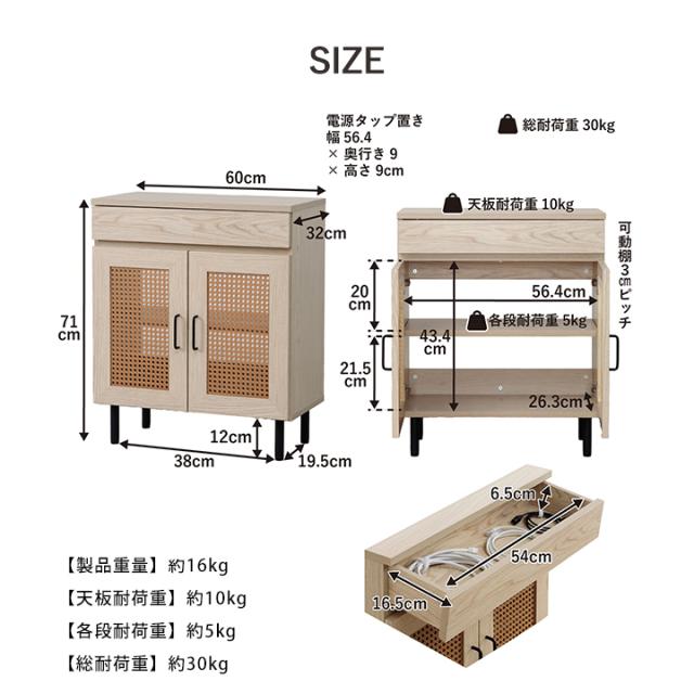 | ■ お部屋に自然と馴染む、おしゃれな「かごめ編み」のラタン調ルーター台。 ■ 背面が開いている構造のため、電化製品の熱がこもりにくい。 ■ 天板上部にはコードを通せるスペースがあり、位置の調整も可能です。 ■ コード収納に便利な引き出しは、内寸54×16.5×6.5cmで大容量設計です。 ■ 扉内の収納は、3cm間隔で調整できる可動棚になっており、用途に応じて高さを変更可能。 ■ 天板の奥行きは32cmあり、ディスプレイスペースとしても使用可能。 脚部はマットな質感のスチール製。付属のアジャスターにより高さ調整ができます。 ■ 本製品はお客様ご自身での組立が必要です。 ■ 耐荷重は全体で約30kg、天板部分は約10kg、その他の板は約5kgです。 |