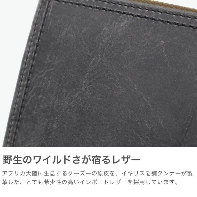 ハードな質感のクーズーレザーを使用した『KUDU シリーズ』のコンパクトウォレット。アフリカ大陸に生息するクーズーの原皮を使用し、野生に生きた証としてのキズやシワなどが無数にあるのが特徴的。製品によっては大きな個体差が現れる革ですが、ワイルドさ宿るその見た目によってオリジナルの表情をお楽しみいただけます。さらに、ワックス加工を施すことにより、経年変化によるツヤが出て更なる深みが増し、唯一無二の仕上がりとなっています。