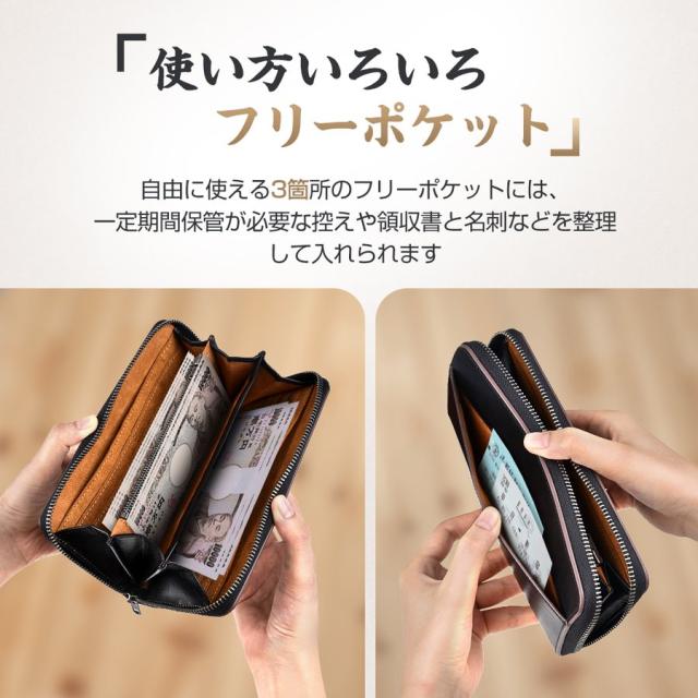 ベーシックな小銭入れつきの長財布で、カード入れは10枚分つき。 背面にもポケットつきでレシートやチケットなどの収納までも、いつでも綺麗に整理できます。