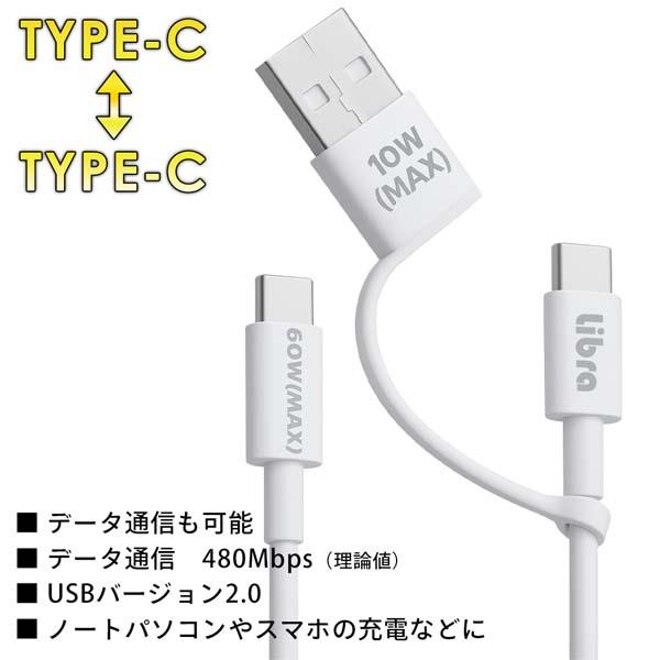 | 60W PD 変換アダプタつき 超!急速充電・通信ケーブル Type-C⇔Type-C 2m |
