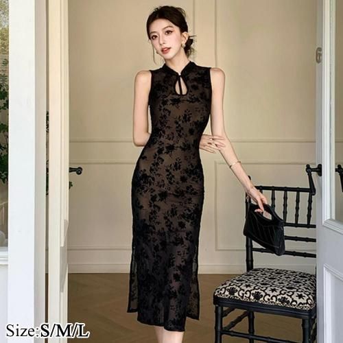 キャバ ドレス キャバドレス ワンピース ミディアムドレス クラシカル シースルー シルエット スリット タイト チャイナ バストライン ボディライン 安心感 華やか 自然 胸元 大人 肌見せ レース ブラック S M L