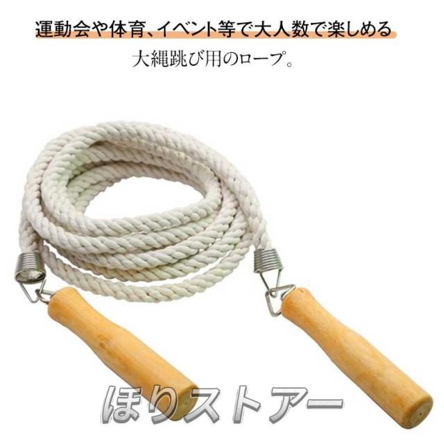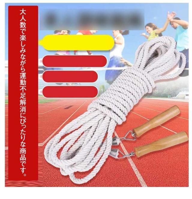 | 運動会や体育、イベント等で大人数で楽しめる大縄跳び用のロープ。 5m/7m/10mの3種類のバリエーションをご用意しております。 なじみやすい木製グリップ 、回しやすいので手が痛くなりにくい。 ロープにも少しの重みがあり回すので人の負担を軽減してくれます。 大人数で楽しみながら運動不足解消にぴったりな商品です。 | |