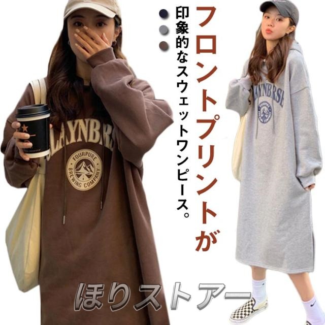 パーカーワンピース 裏起毛 パーカー ゆったり フード付き 膝下丈 ワンピース レディース ロング丈 パーカー サイドスリット スウェットワンピース プルオーバー フーディー 厚手 秋 冬 防寒 保温 暖かい オーバーサイズ 韓国ファッション 体型カバー ロゴ 部屋着