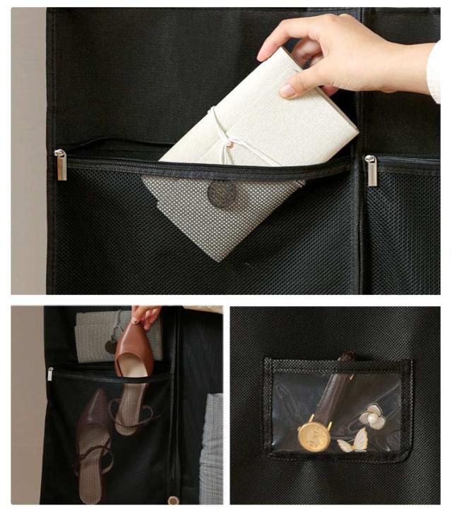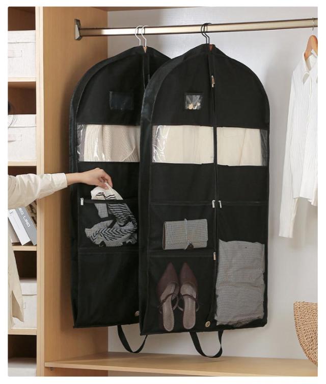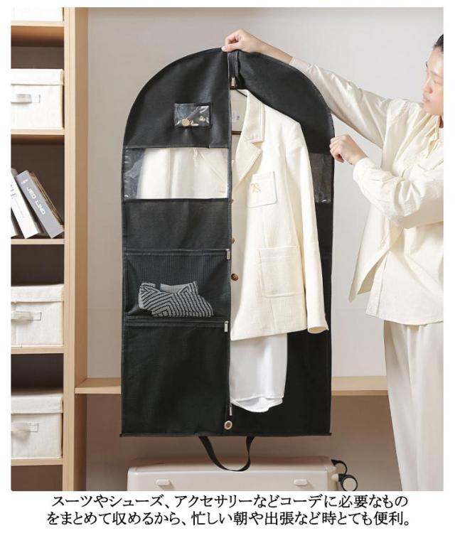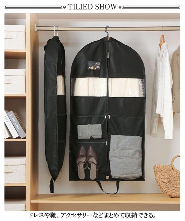 | 全3サイズ 下着やバッグ、シューズ、アクセサリーなどを入れるのに便利なポケット付きの洋服カバー。 ドレスや靴、アクセサリーなどまとめて収納できる。 スーツやシューズ、アクセサリーなどコーデに必要なものをまとめて収めるから、忙しい朝や出張など時とても便利。 出張先に、実家での法要のため帰る時など冠婚葬祭の時にも役に立つ優れ物です。 | |