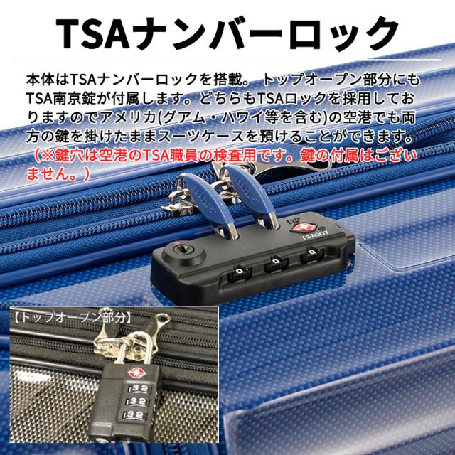 施錠:TSAナンバーロック(本体)+TSAダイヤル南京錠(トップオープン部)