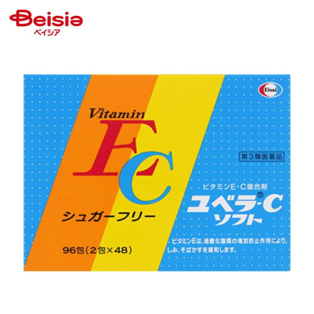 | 作用と特徴 | ユベラ-Cソフトは、体内で協力し合うビタミンEとビタミンCを効果的に配合した シュガーフリー(砂糖を含まない)で、しかも味の良い顆粒剤です。 しみ、そばかすや末梢血行障害による肩・首すじのこり、手足のしびれ・冷えの緩和に、 また肉体疲労時や体力低下時のビタミンE・C補給に適しています。 |