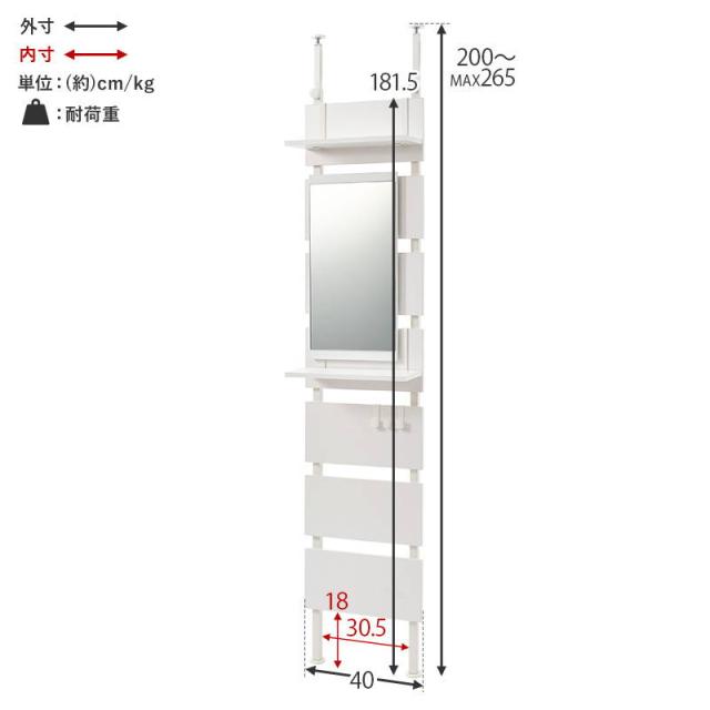 突っ張りラック 2m-2.65m 幅40cm 鏡付き ミラー付きウォールラック 玄関 寝室 ドレッサー 賃貸 穴開け無し