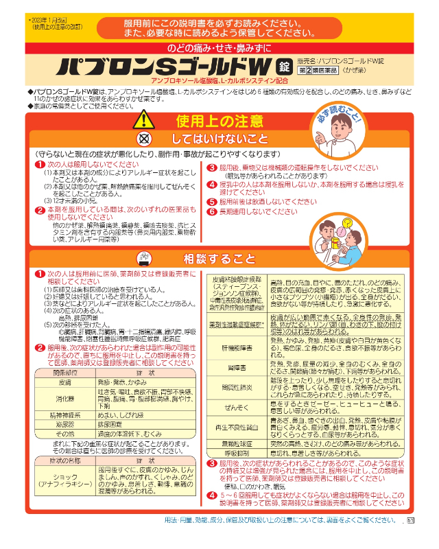 また、パブロンSゴールドW錠は指定第2類医薬品です。小児、高齢者他、禁忌事項に該当する場合は、重篤な副作用が発生する恐れがあります。詳しくは、薬剤師または登録販売者までご相談ください。
