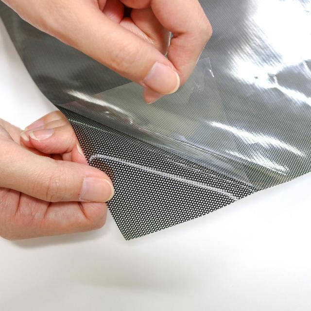 網戸サッシや窓に取り付けるだけ暑さ対策できるシート。遮熱効果-18℃。紫外線(約)77%カット。赤外線(約)62%カット。夏場の冷房負担(約)33%削減。目隠し効果。