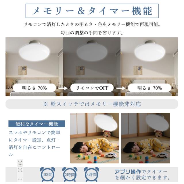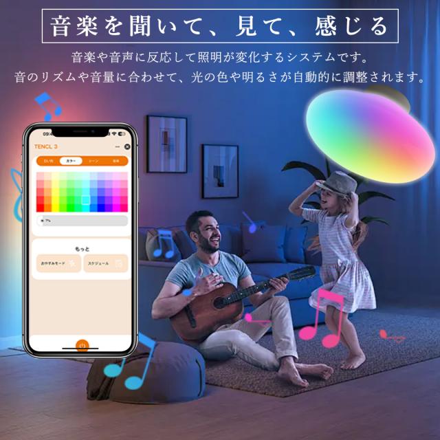高効率LEDチップ採用で従来蛍光灯の約2倍明るく電気代を半分以下に節約、厚さ1cmの超薄型設計でお部屋を広く見せます。音楽や声に反応して光が変化し、Bluetooth接続+専用アプリで外出先からも操作可能。3000K〜6000Kの無段階調光調色、メモリー・タイマー機能付きで多彩なシーンに対応。チラつきゼロで目に優しく、防虫防塵仕様で清潔。PSE認証取得済み・1年保証付き、寿命50,000時間で長く安心して使えます。