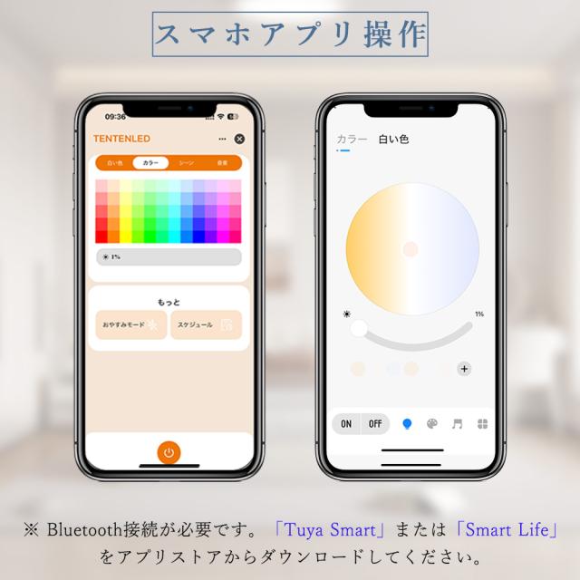 - Bluetooth接続後、専用アプリ「Tuya Smart / Smart Life」をダウンロードすれば、スマホから照明を自由に操作可能。外出先からでも快適にコントロールできます。
