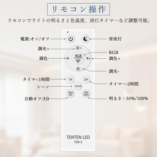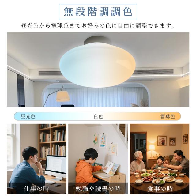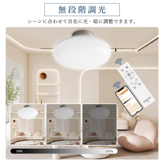 - リモコン&専用アプリで、色温度(3000K〜6000K)を自由に調整でき、明るさも10%〜100%まで無段階に設定可能。あたたかい団らんの時間、集中したい作業シーン、リラックスした読書タイムなど、様々なシーンにぴったりの照明を演出します。
