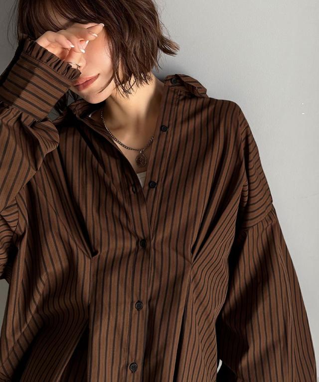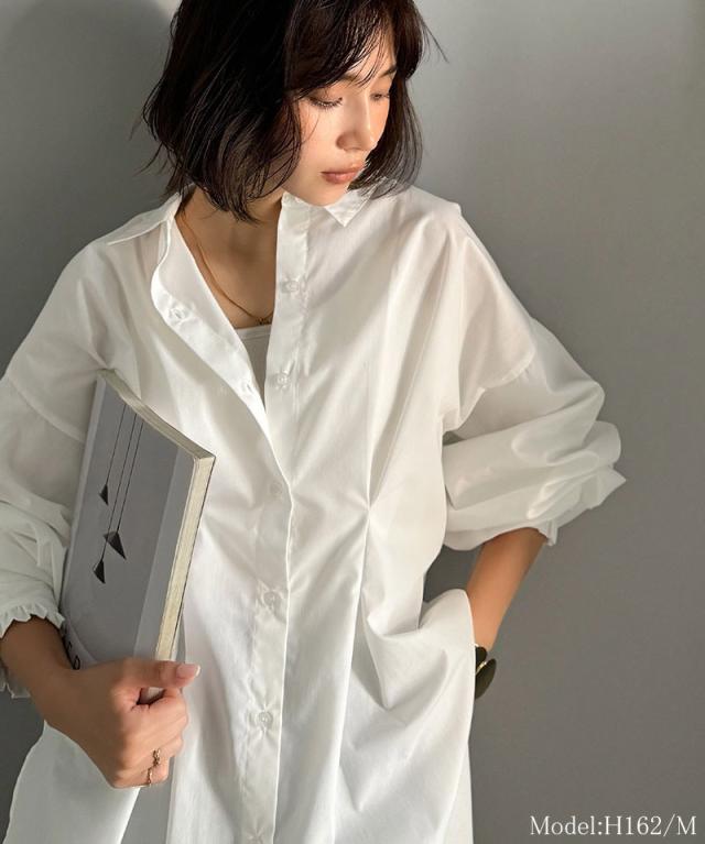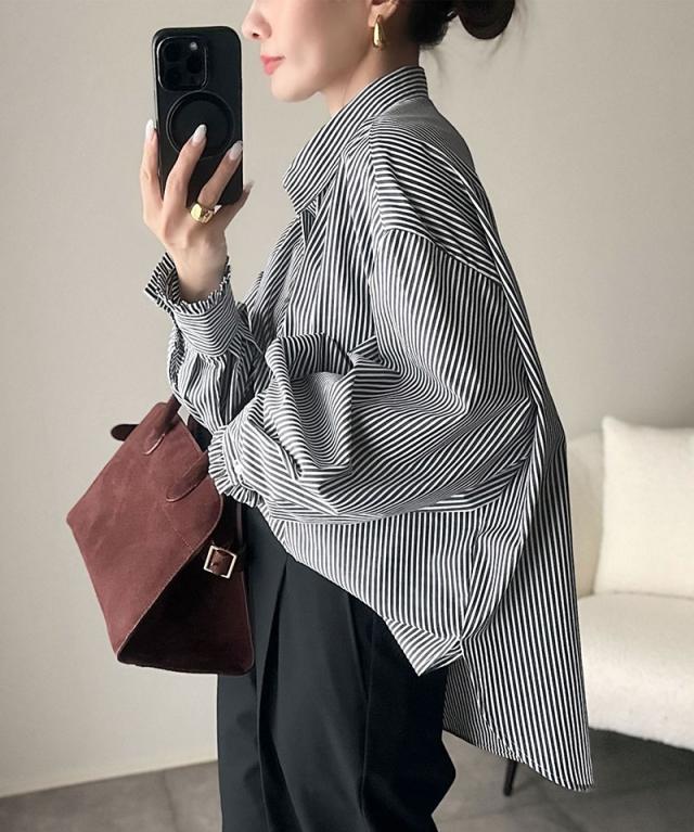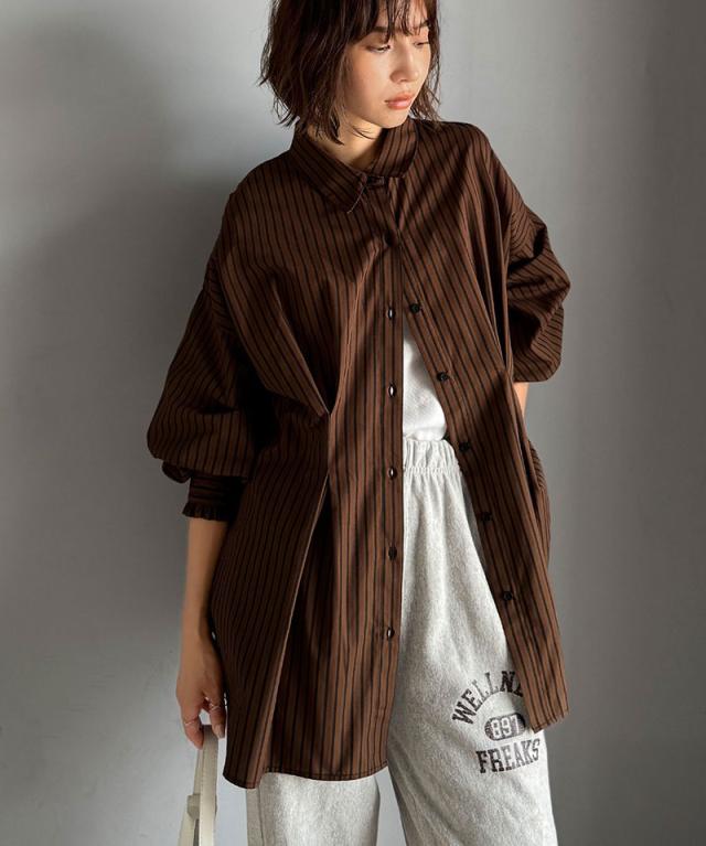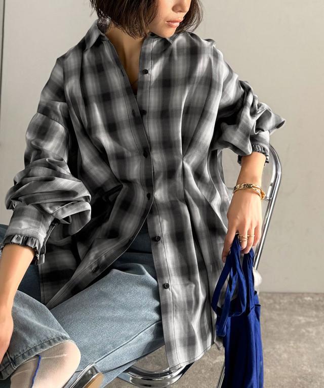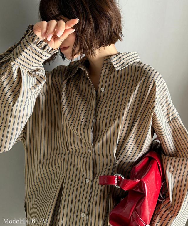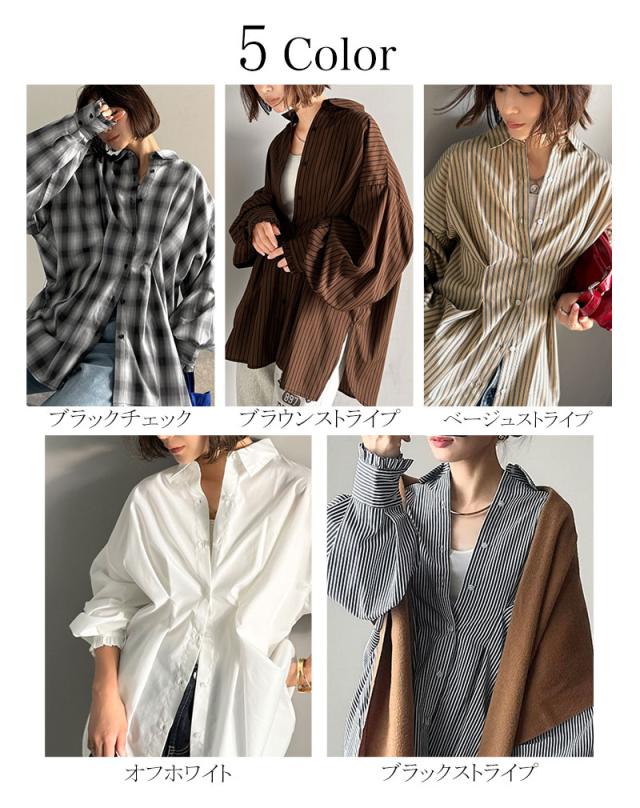クラシカルエルフ秋新作 トップス ブラウス レディース 長袖シャツ ウエストタック 袖フリル 無地 チェック ストライプ 立体感 抜け感 羽織り ゆったり ビッグシルエット アウター ロングシーズン オンオフ 大きいサイズ 2025aw ce1110127