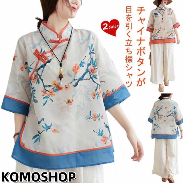 薄手 ブラウス レディース 綿混 チャイナ風ブラウス スタンドカラー チャイナ風ブラウス チャイナシャツ 花柄 5分袖 チャイナボタン トップス ブラウス プルオーバー ボリューム袖 中華風 ゆったり 体型カバー ナチュラル
