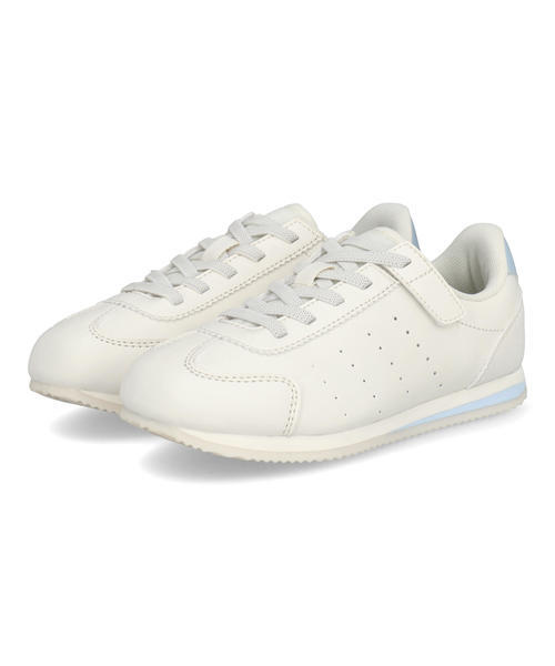 オフホワイトでまとめたシンプルなデザインに、踵とソールに配したポイントカラーや、サイドのパンチングがさりげないアクセント♪