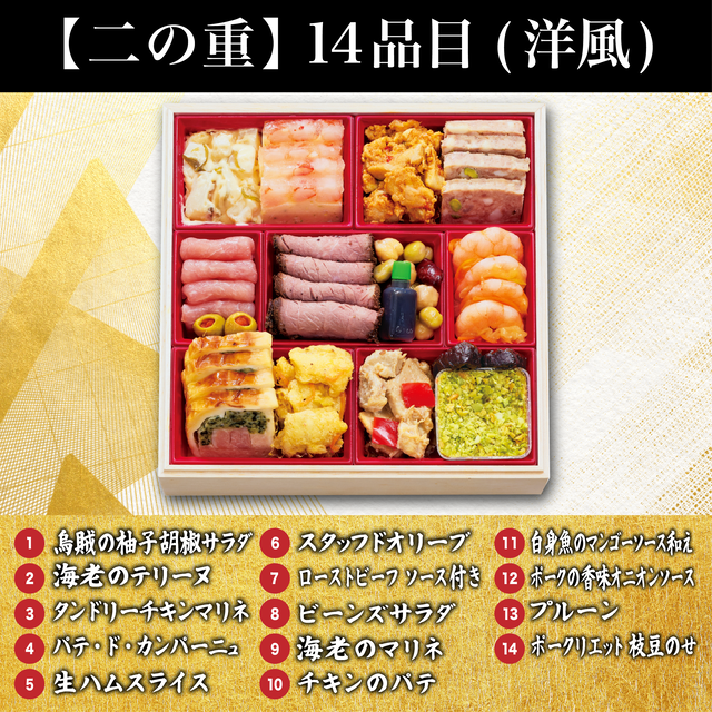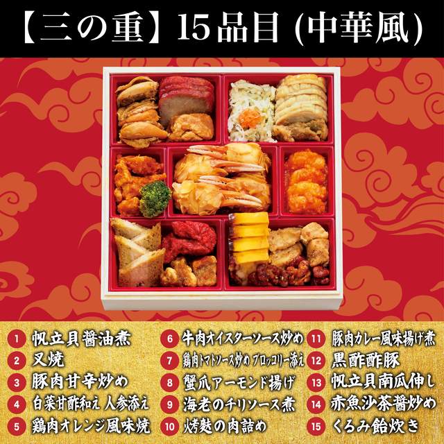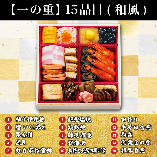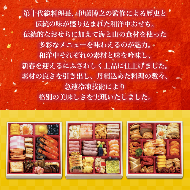第十代総料理長、伊藤博之の監修による歴史と伝統の味が盛り込まれた和洋中おせち。伝統的なおせちに加えて海と山の食材を使った多彩なメニューを味わえるのが魅力。和洋中それぞれの素材と味を吟味し、新春を迎えるにふさわしく上品に仕上げました。素材の良さを引き出し、丹精込めた料理の数々、急速冷凍技術により格別の美味しさを実現いたしました。