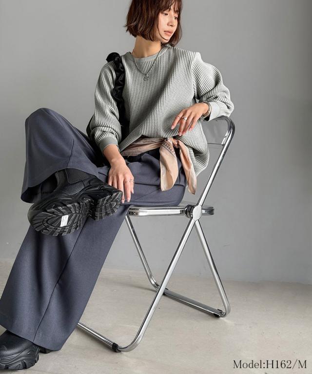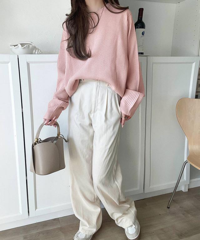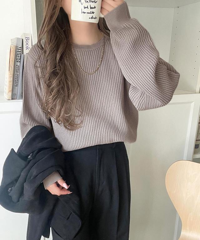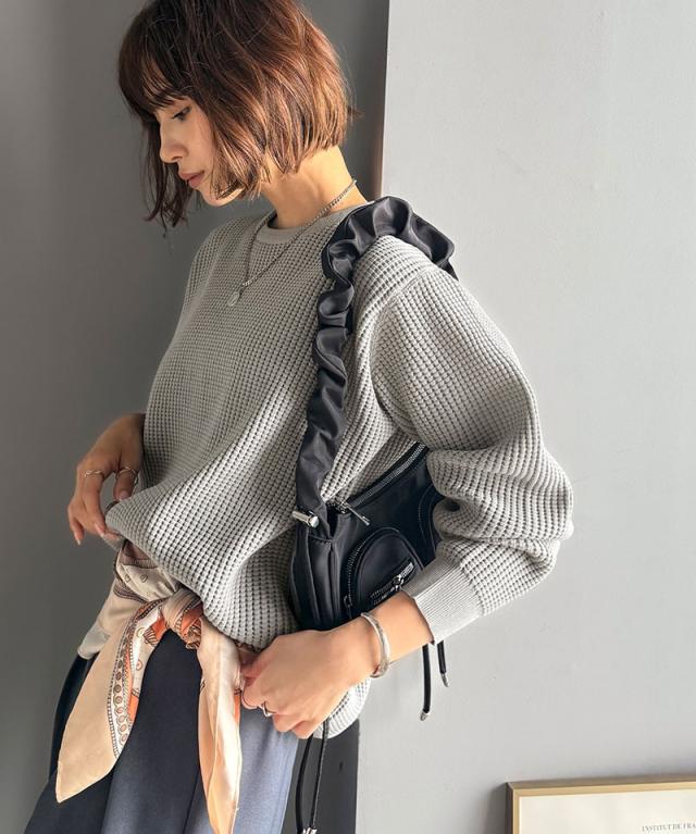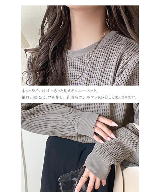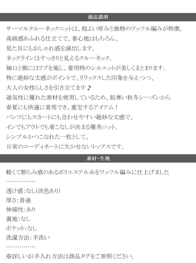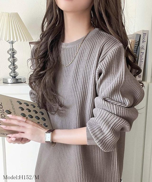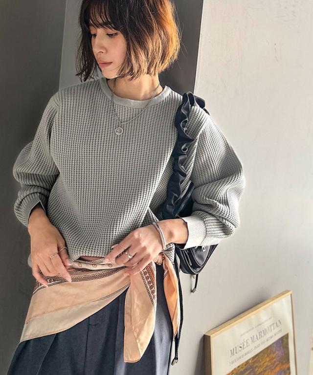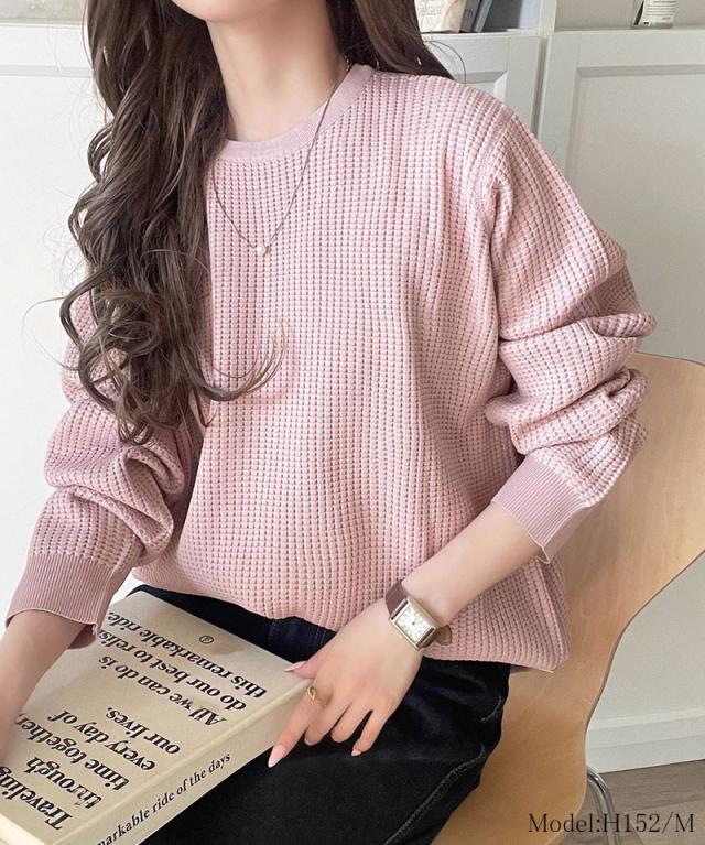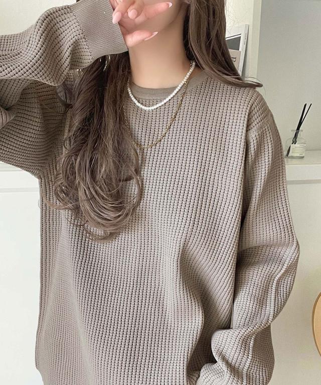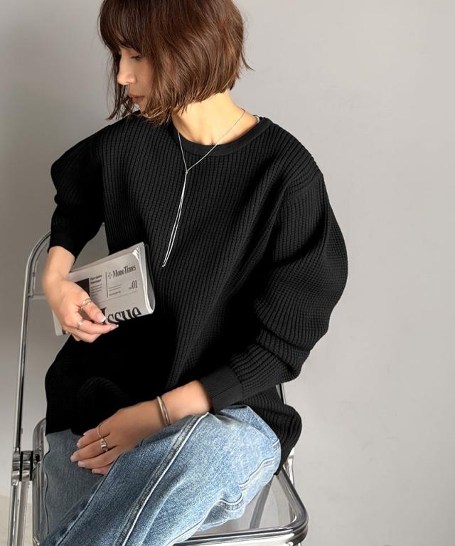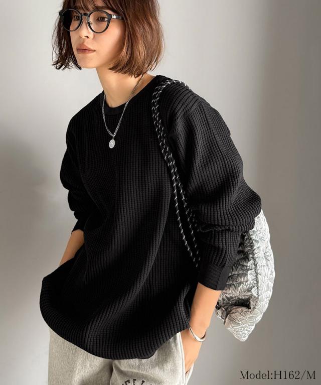 サーマルクルーネックニットは、程よい厚みと独特のワッフル編みが特徴。