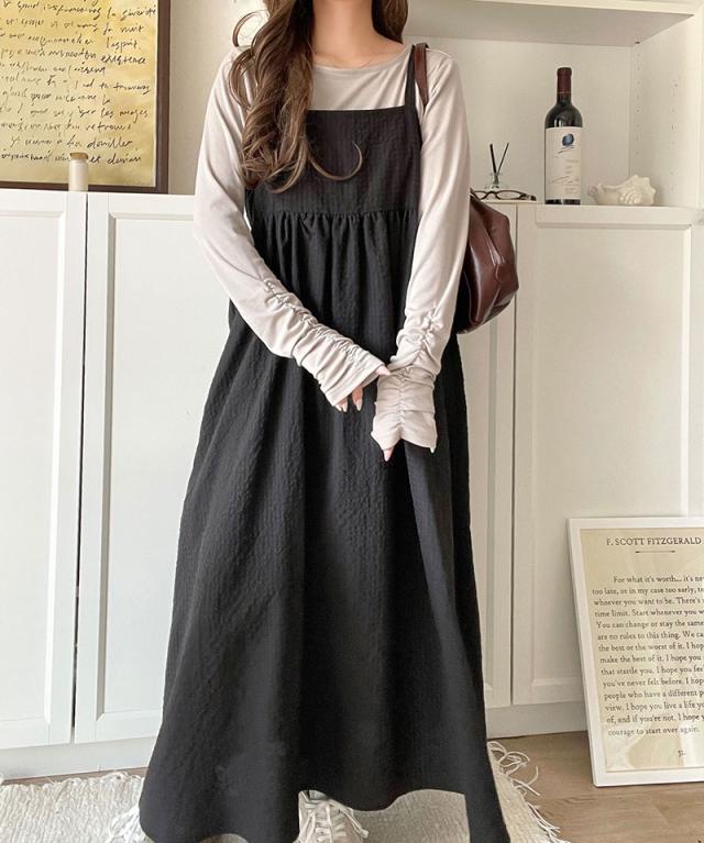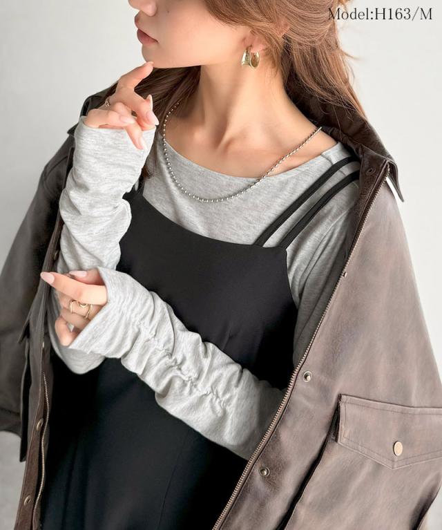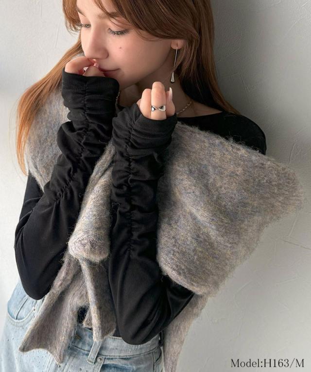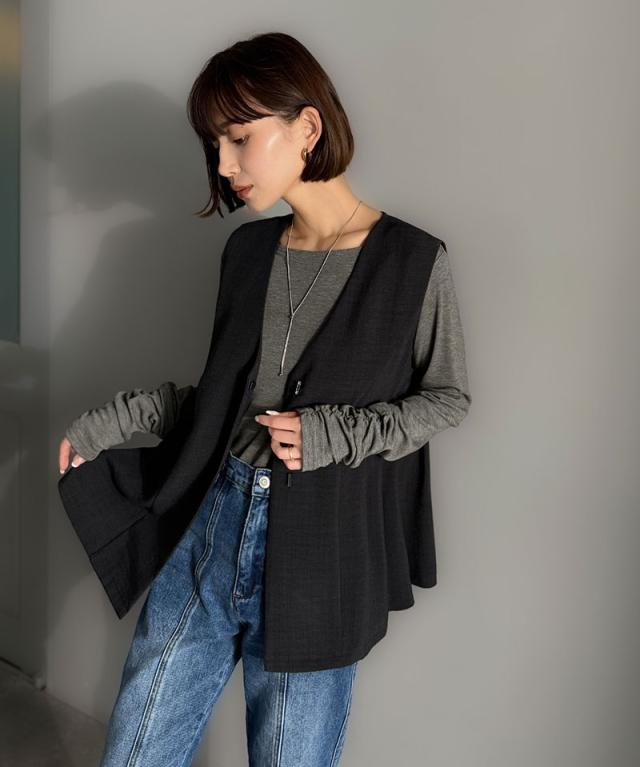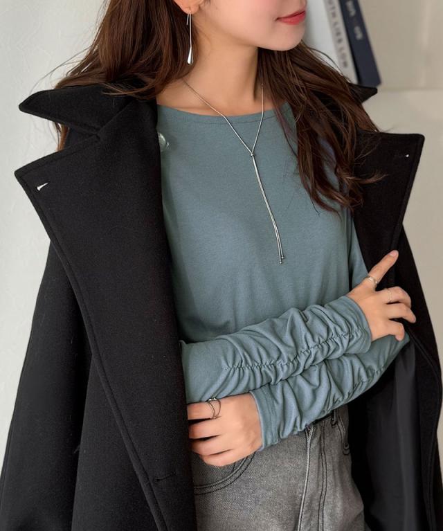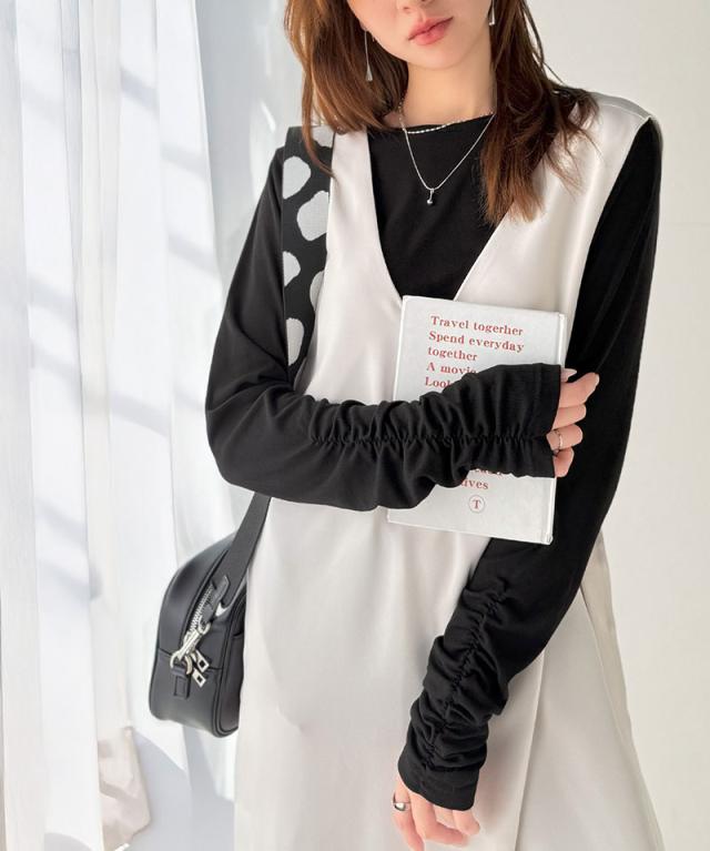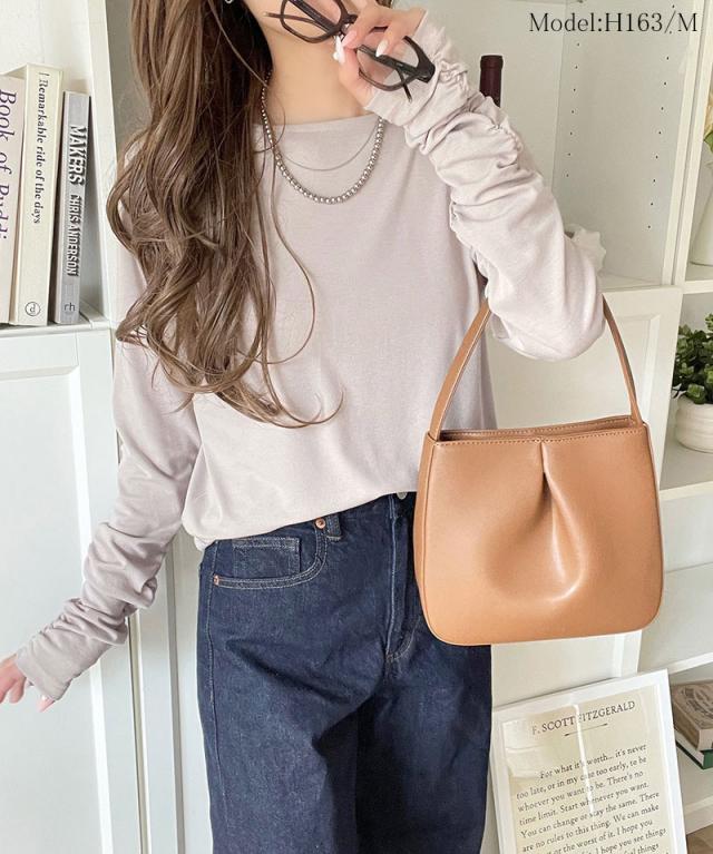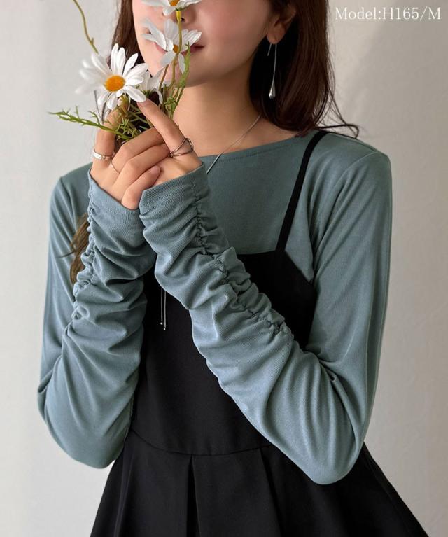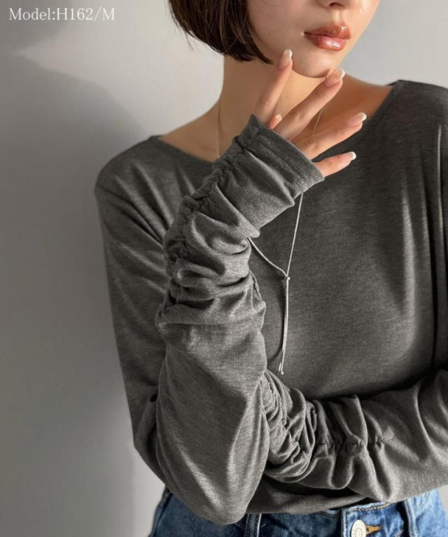 袖口にはシャーリングが施されており、デザインにアクセントを加えつつ、柔らかさを演出。