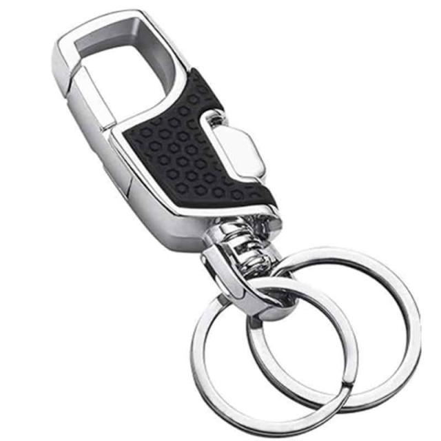 【リングデザイン】360°回転ボタンが配置されており、使用時に押すだけでバッグやズボンに引っ掛けることができるとともに、亜鉛合金の材質が頑丈で耐久性があり、引っ掛けた鍵の脱落紛失を防ぐことができる。