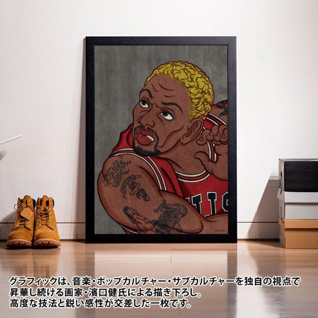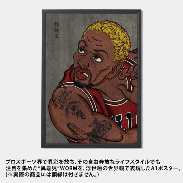 プロスポーツ界で異彩を放ち、その自由奔放なライフスタイルでも注目を集めた"異端児"WORMを、浮世絵の世界観で表現したA1ポスター。グラフィックは、音楽・ポップカルチャー・サブカルチャーを独自の視点で昇華し続ける画家・濱口健氏による描き下ろし。高度な技法と鋭い感性が交差した一枚です。