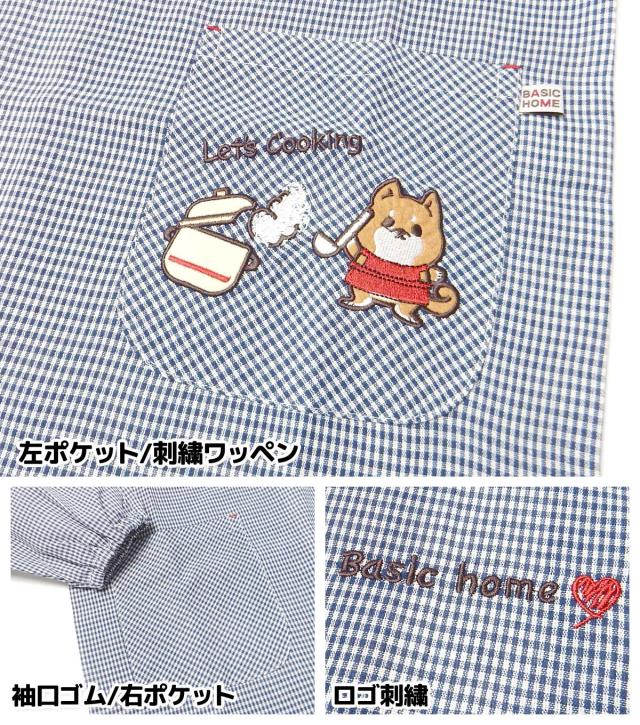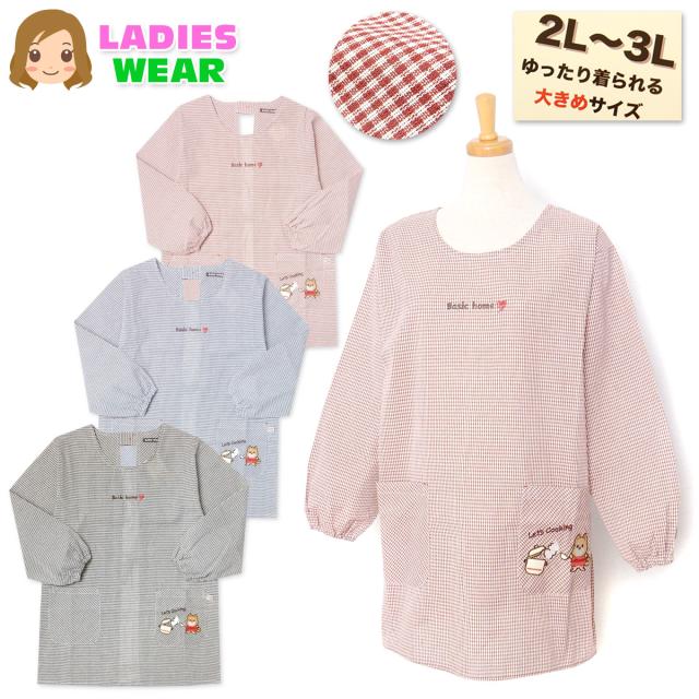 【送料無料】【大きいサイズ】婦人 レディース 割烹着 エプロン 後ろボタン&ひも留め ギンガムチェック いぬ刺繍ワッペン ポケット付き 2L-3L sl-0637【メール便対応】