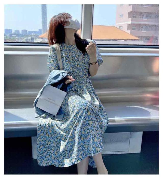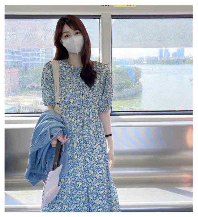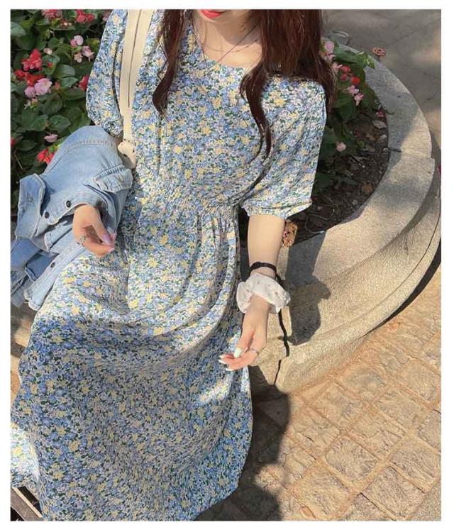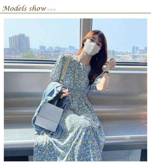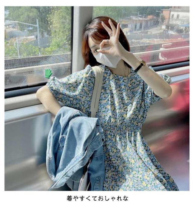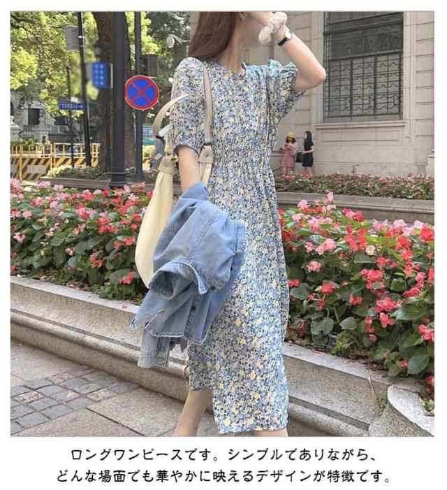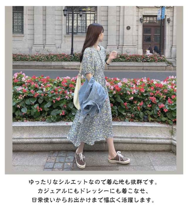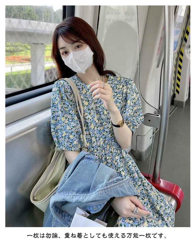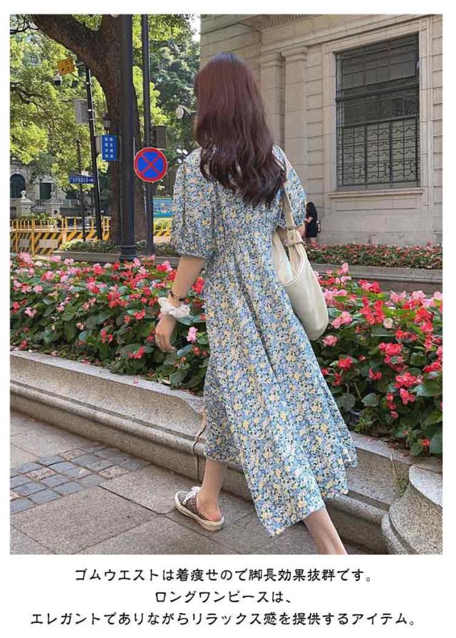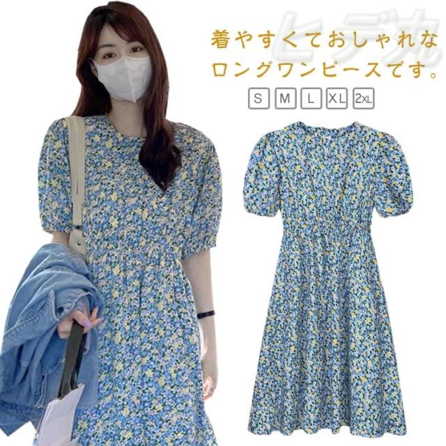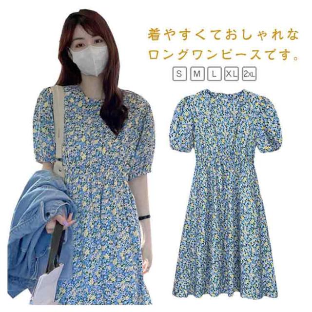花柄 おしゃれ レディース 半袖 ゴムウエスト ワンピース 美脚 ワンピース 花柄ワンピース ゆったり 丸襟 トップス ロングワンピース パフスリーブ キレイめ 着やすい カジュアル 通勤 通学 リゾート 春夏秋 レイヤード