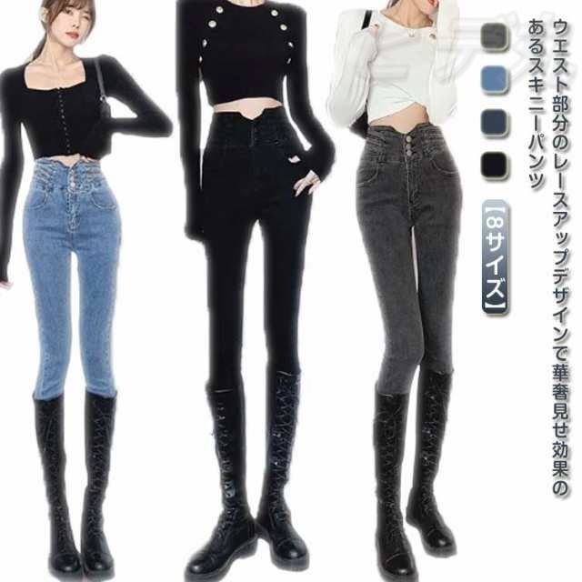 | ウエスト部分のレースアップデザインで華奢見せ効果のあるスキニーパンツ。【8サイズ】 ストレッチデニム素材を使用しているので座ったり曲げ伸ばしも楽々。 ウエスト?裾にかけてフィットする美脚ラインで美シルエットをメイクします。 しっかりとした生地感で足を引き締め脚長効果も◎オールシーズン穿きやすいのがポイント♪ サイズも25-32まで8サイズ展開なので、あなたにピッタリのサイズが見つかります。 シンプルで着回しは無限大です。 | |