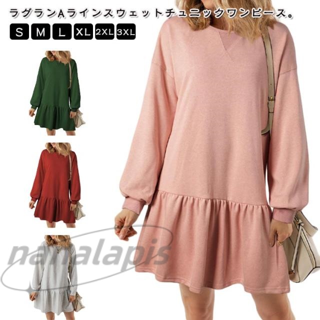 膝上丈 スウェット 裾フリル トレーナー ラグラン プルオーバー スエット 長袖 ペプラム 長め トップス チュニック チュニックワンピース Aライン ロング丈 グレー ゆったり リラックス 送料無料 チュニック ブラック ピンク ブルーグレー レッド グリーン