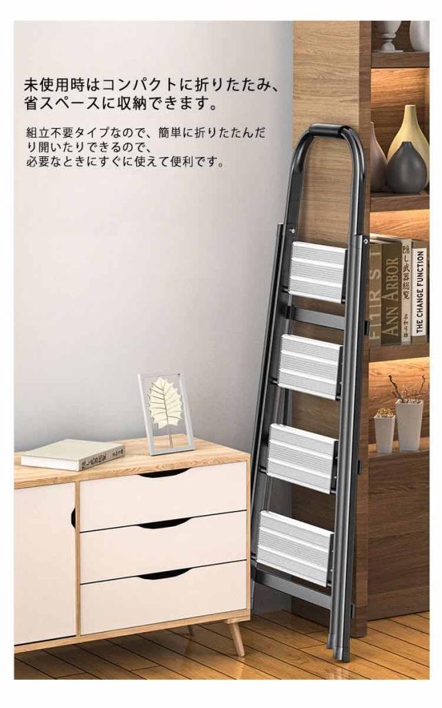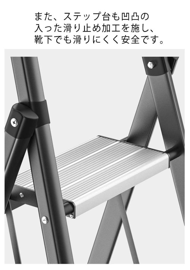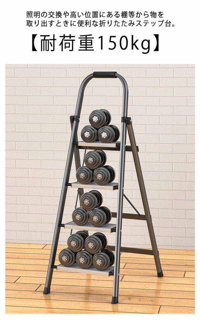 | 照明の交換や高い位置にある棚等から物を取り出すときに便利な折りたたみステップ台。【耐荷重150kg】 上部に持ち手がついているので安心!最上段まで安全に上がれます。 ステップ部分はアルミ製でフレームは耐久性に優れたスチール製を採用。重量軽減ながら強度があり傷にも強いので長くお使い頂けます。 滑りにくい脚キャップ付きです。また、ステップ台も凹凸の入った滑り止め加工を施し、靴下でも滑りにくく安全です。安定感がありストレスなく昇り降りができるほか、長時間でも作業しやすいです。 未使用時はコンパクトに折りたたみ、省スペースに収納できます。 高いところからものを取り出すためだけではなく、エアコン掃除に/車の洗車に/電球や電灯交換に/撮影スタンド用に/高い所の窓拭きに/壁に時計など飾るとき等々、いろんなシーンで大活躍する脚立です。 組立不要タイプなので、簡単に折りたたんだり開いたりできるので、必要なときにすぐに使えて便利です。 | |