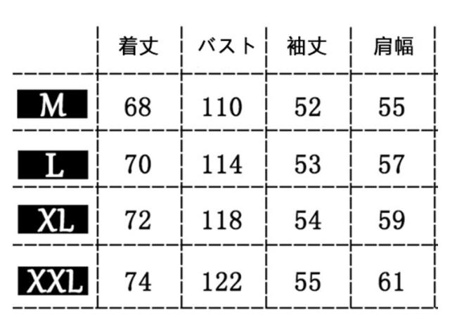 | サイズについての説明 | M 着丈68cm バスト110cm 袖丈52cm 肩幅55cm L 着丈70cm バスト114cm 袖丈53cm 肩幅57cm XL 着丈72cm バスト118cm 袖丈54cm 肩幅59cm 2XL 着丈74cm バスト122cm 袖丈55cm 肩幅61cm |