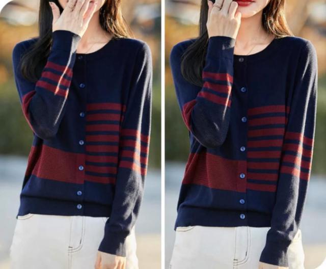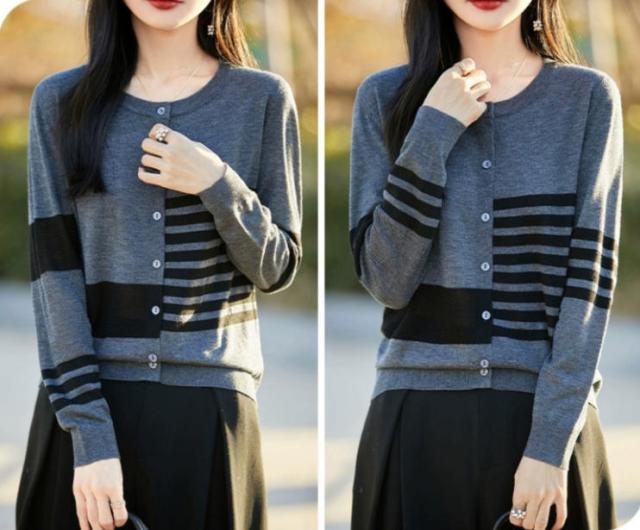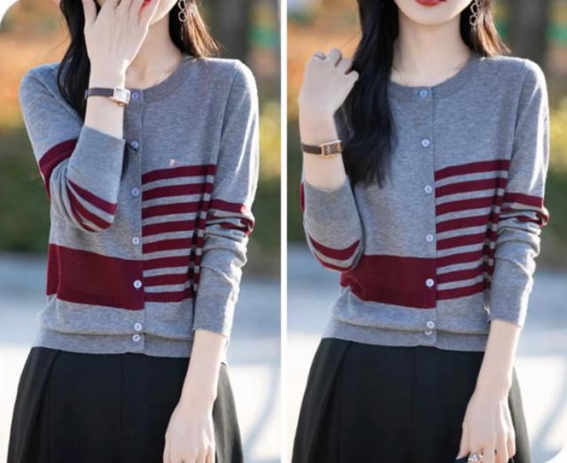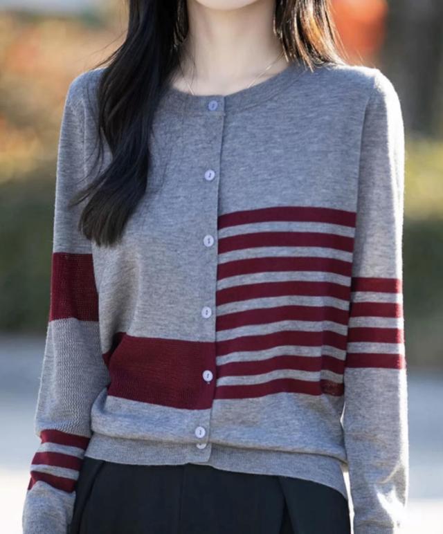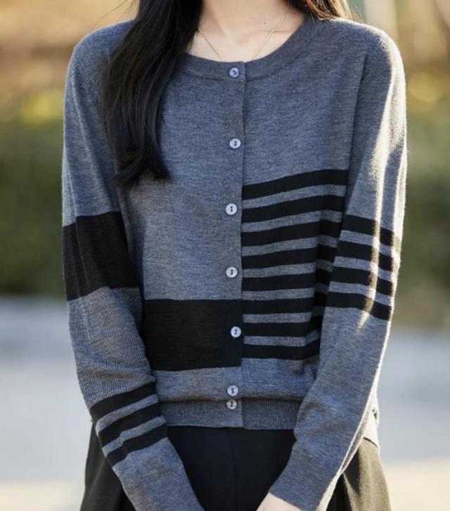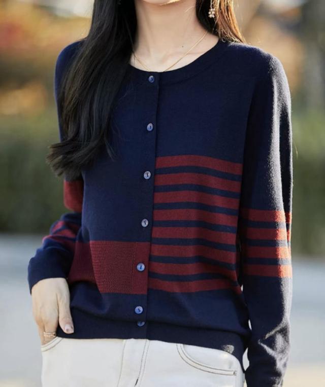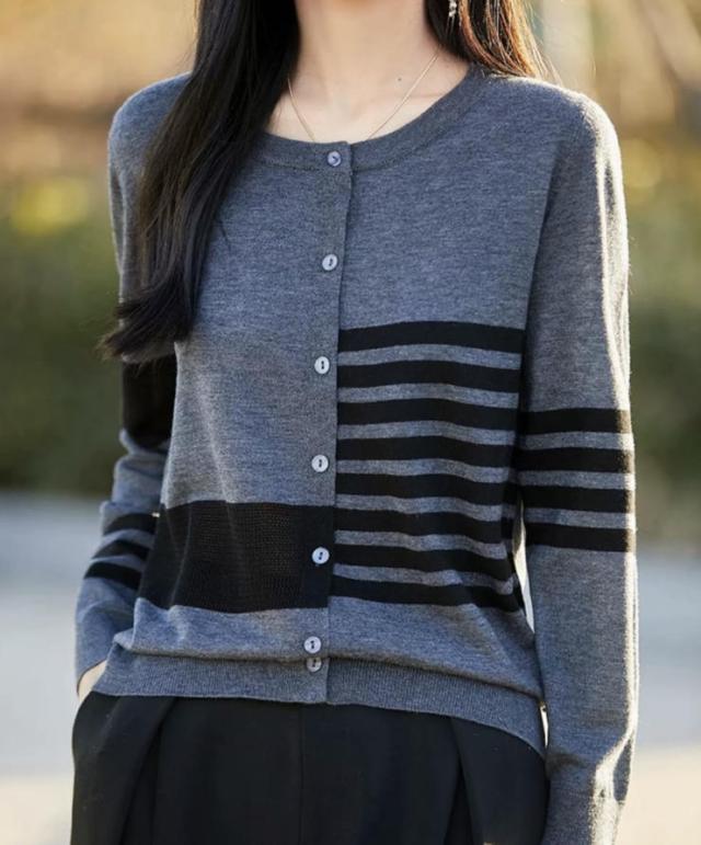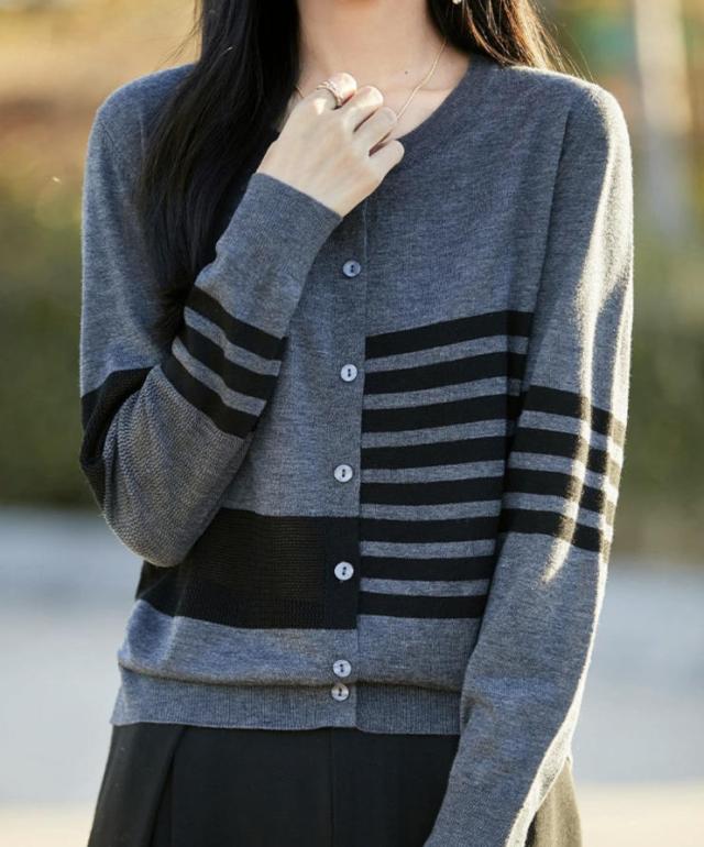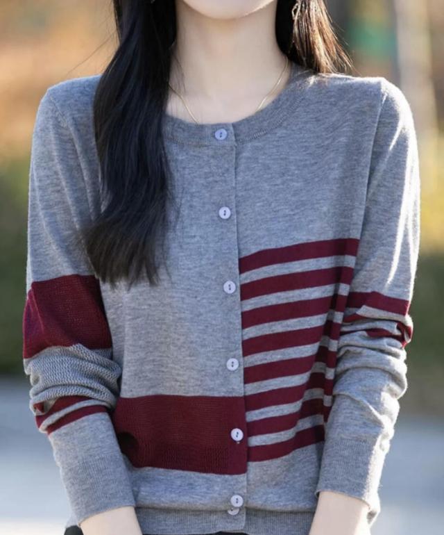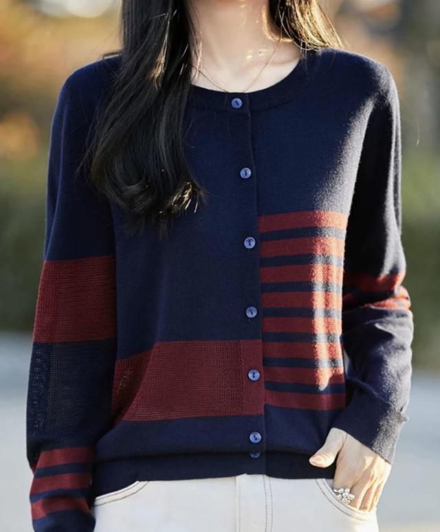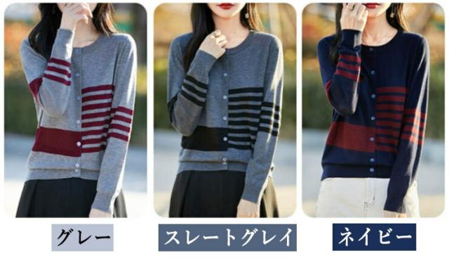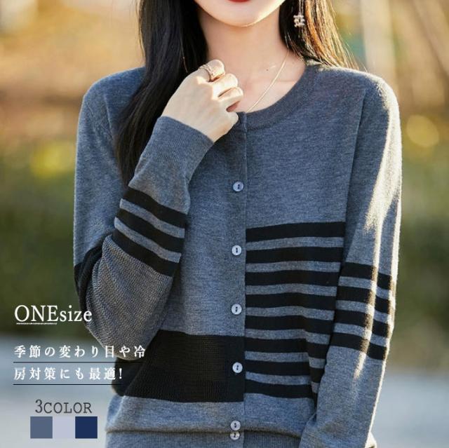 カーディガン レディース ニット 長袖 ボタン ボーダー 羽織り トップス アシンメトリーなボーダー ラウンドネック カジュアル フェミニン 体型カバー 薄手 上品 大きめ ゆったり 冷房対策 春 夏 秋
