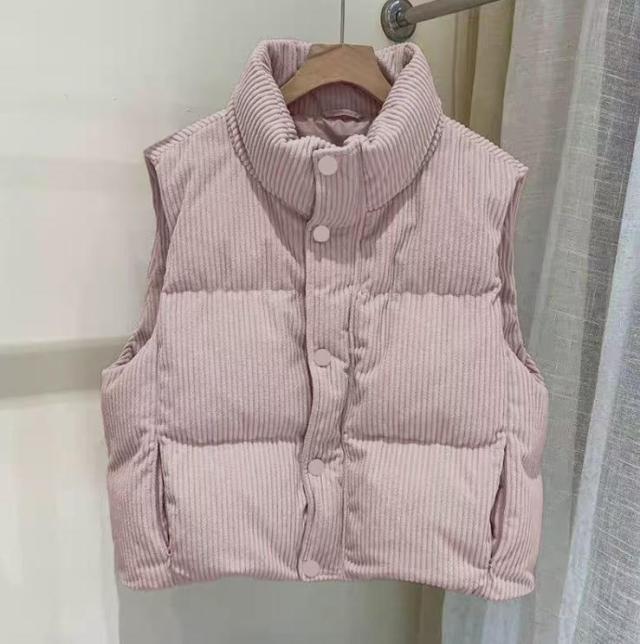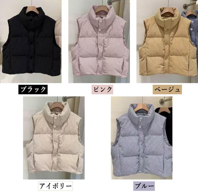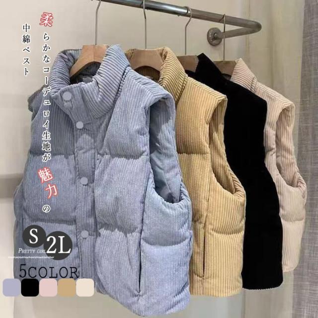 ベスト レディース ジレ コーデュロイ 中綿 ダウンベスト ジャケット アウター ボリューム スタンドカラー 立ち襟 ショート ボタン コーデュロイスト 畝 重ね着 大きサイズ 体型カバー 暖かい 秋冬 防寒 S M L 2L