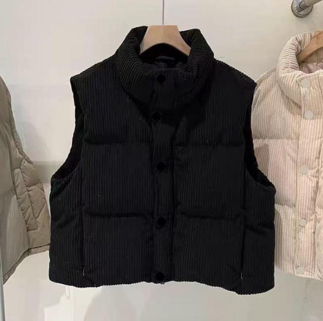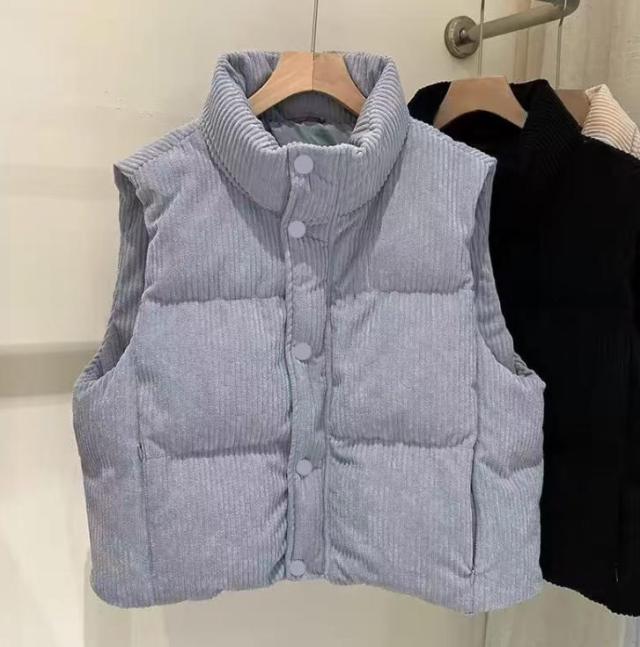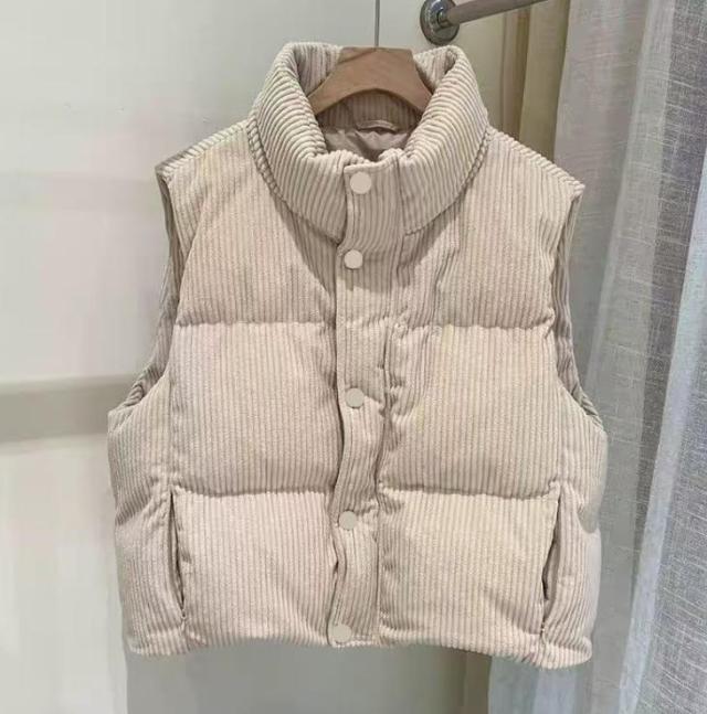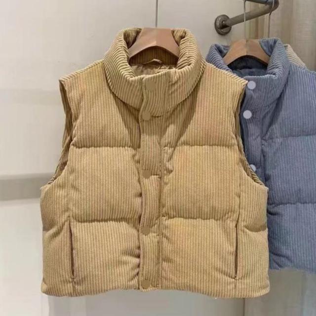 暖かみのあるコーデュロイ素材を使用した、カジュアルな中綿ベストです。スタンドカラーとボタン開閉のデザインで、これからの季節の重ね着にぴったり