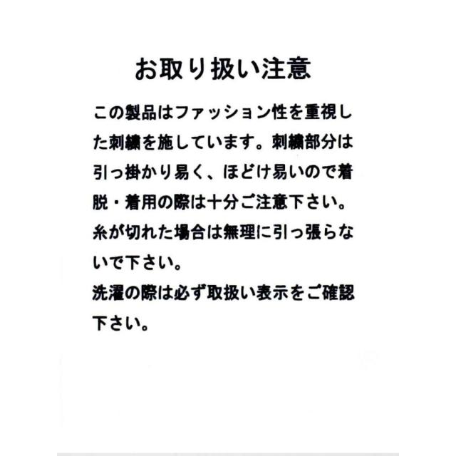 ■素材:素材 | 本体 綿:100% 別布部分 ポリエステル:100% 刺繍糸 ポリエステル:100% 透け感 | オフホワイト若干あり ※インナーのカラー等をお気をつけ下さい 伸縮性 | あり 原産国 | 中国 家庭洗濯 | 可 ポケット | なし
