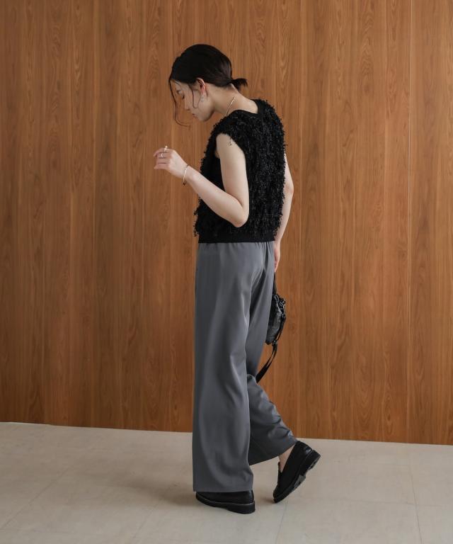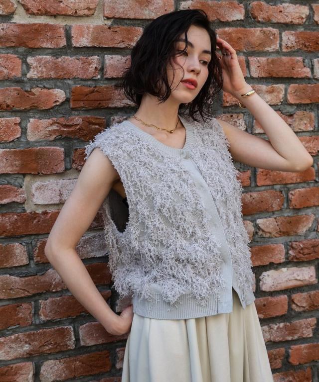 リボンヤーンやリリーヤーンのような糸で編み、ハンドカットでフリンジ加工したニット。身頃本体の糸はさらりとした素材感なので、ロングシーズン使って頂きやすいアイテムです。