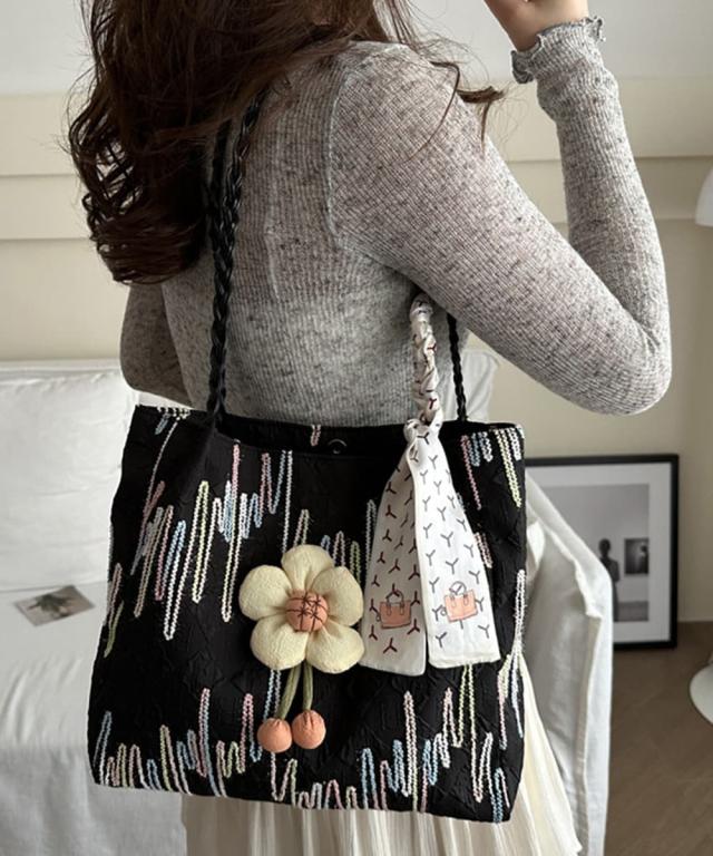 立体的な花モチーフと華やかなスカーフが視線を惹きつけるトートバッグ。