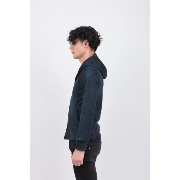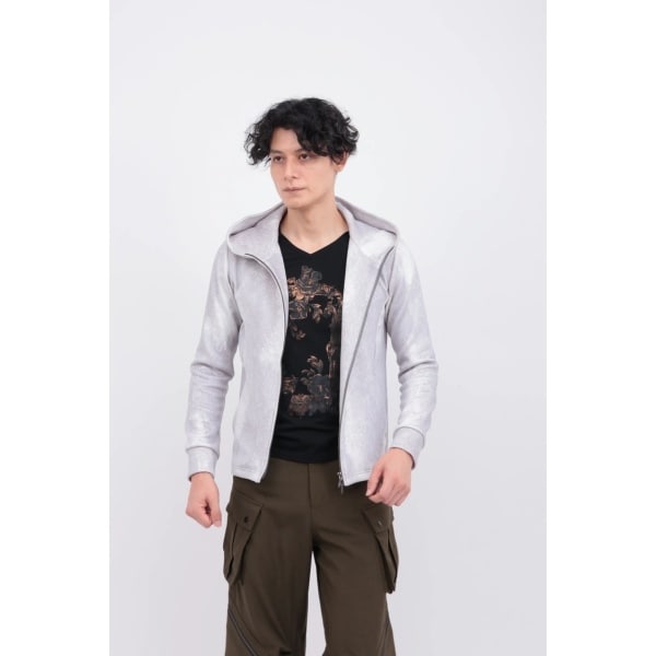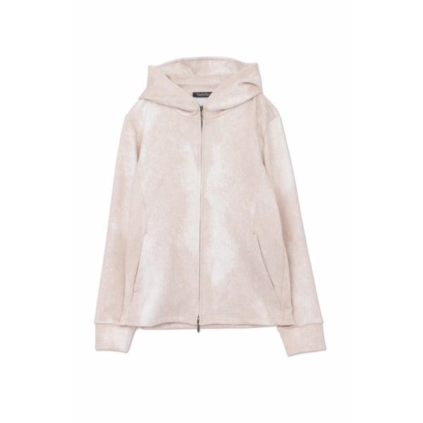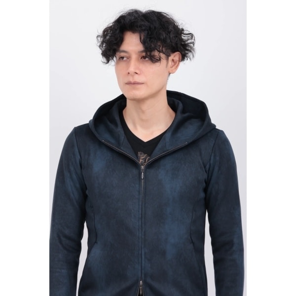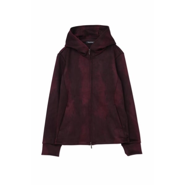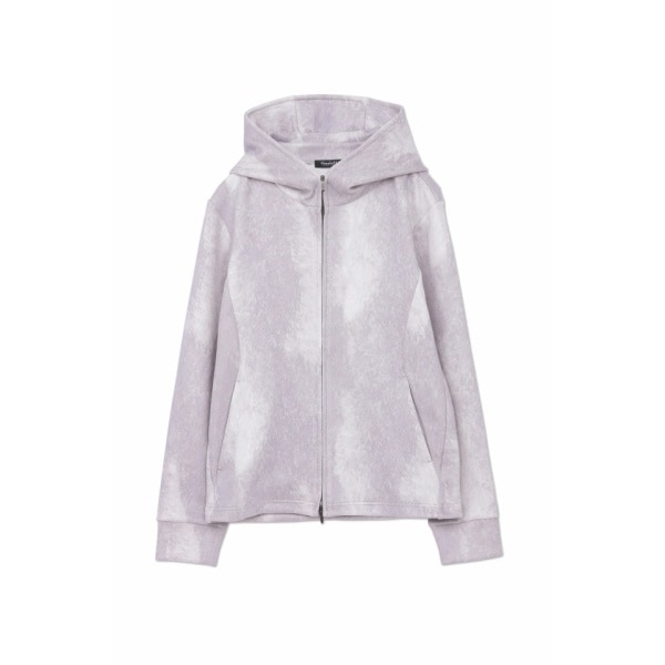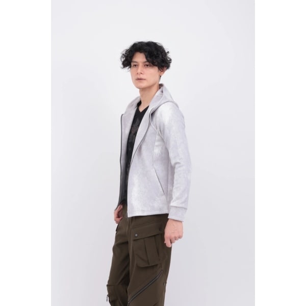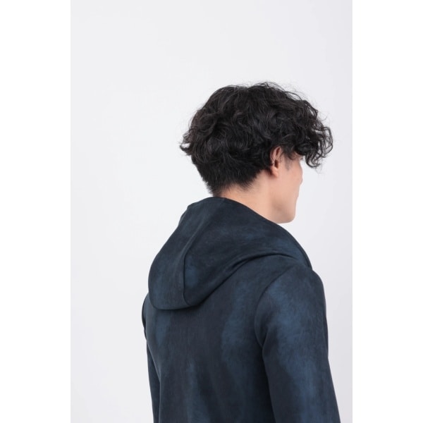 マイクロダンボール×ヘアラインプリント素材を使用したフーディ。