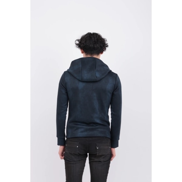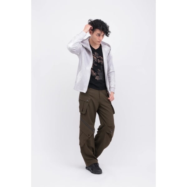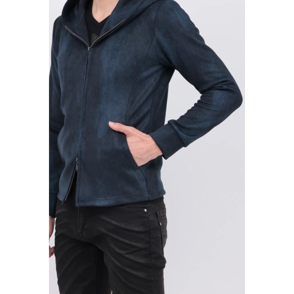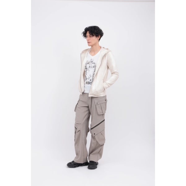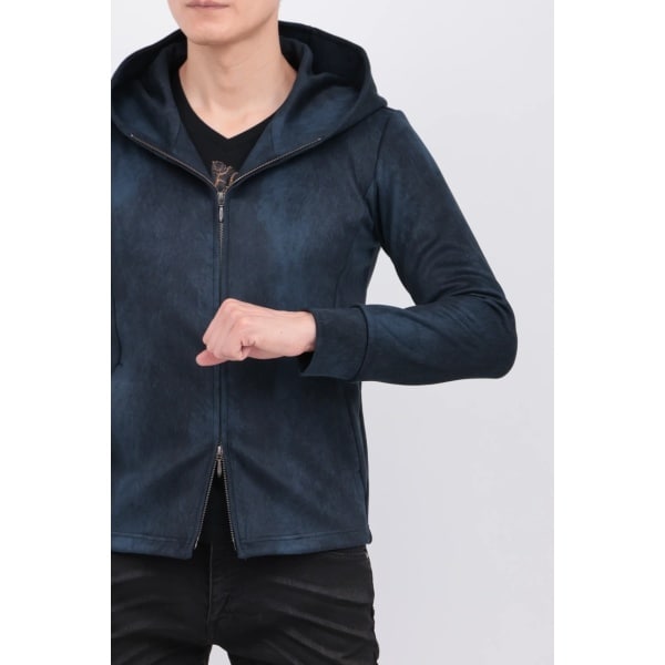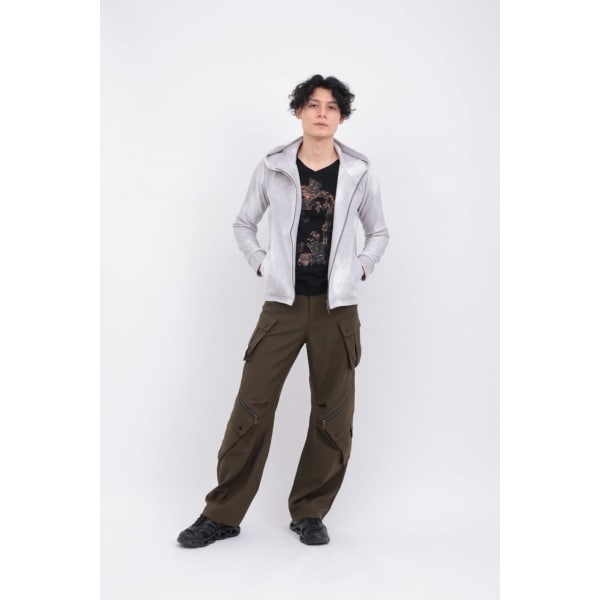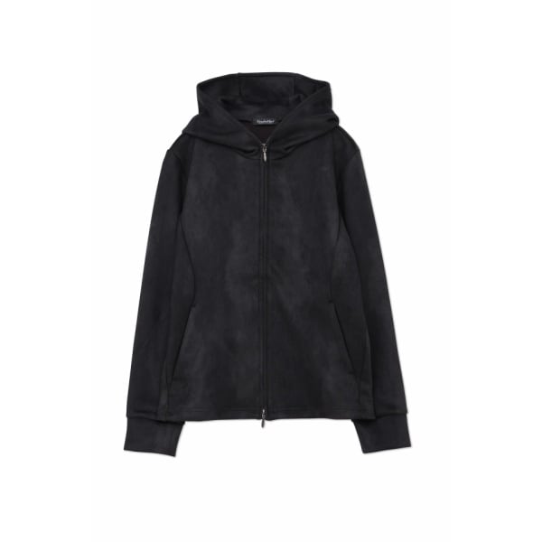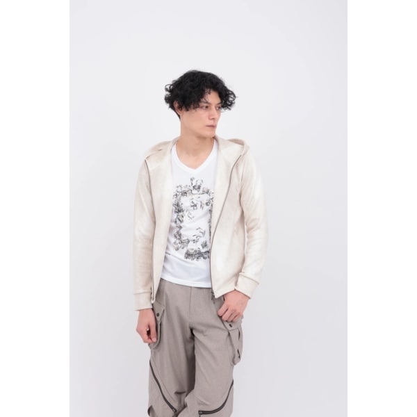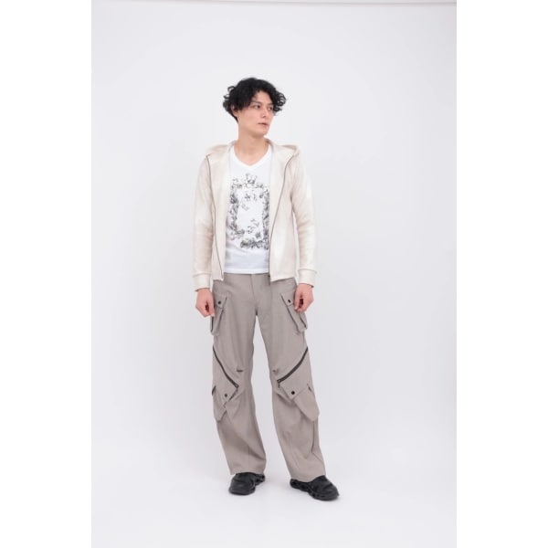 マイクロダンボール×ヘアラインプリント素材を使用したフーディ。