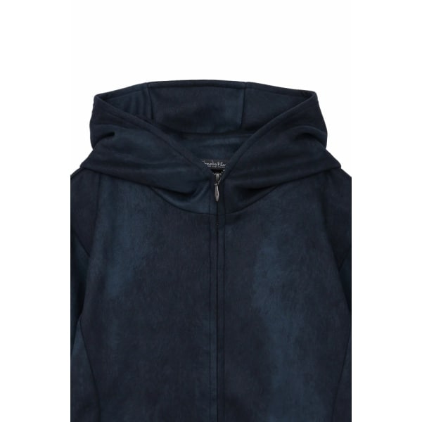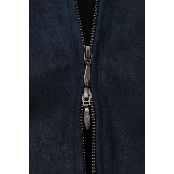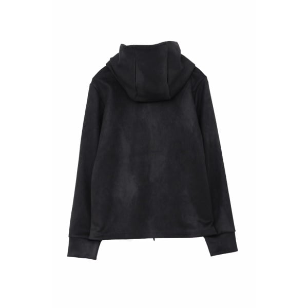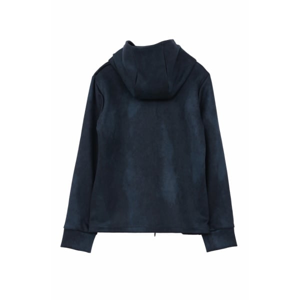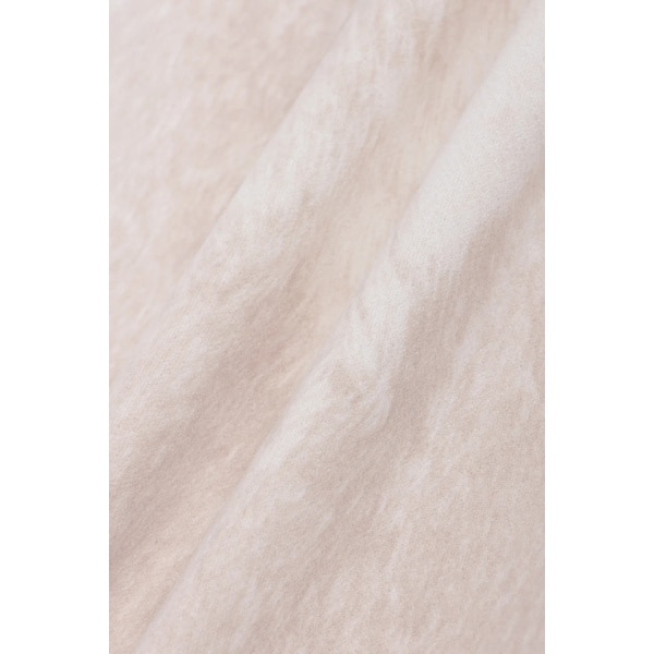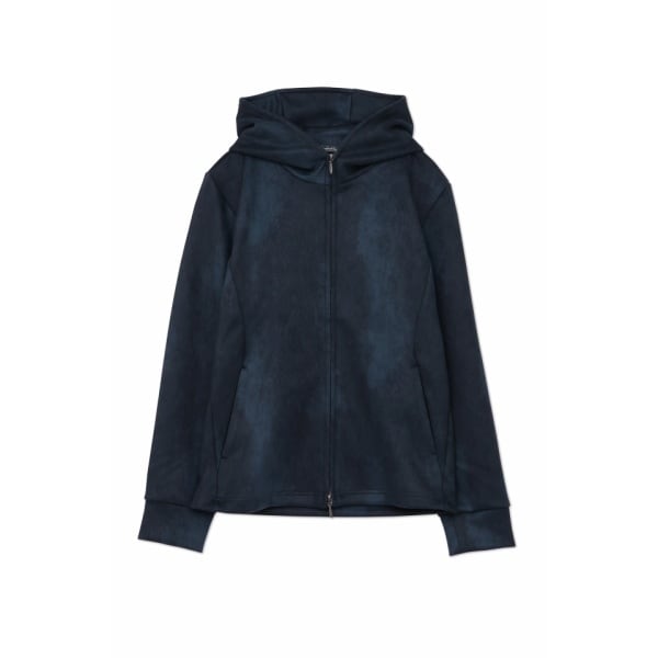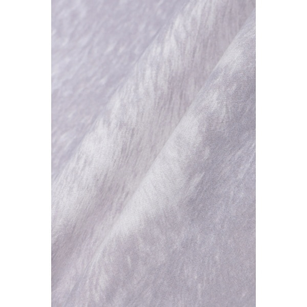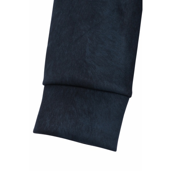 マイクロ起毛のダンボールニット素材。スエードのようなしっとりとした肌触りと、ぷるんとした弾力・適度なハリを両立させています。表の起毛面にヘアライン(毛並)のプリントをし、さりげない柄を表現。ストレッチ性も兼ね揃え、快適な着心地に仕上げています。