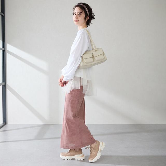 ワントーンのカラーリングの上にキラリと輝くラインストーンが目を引く、大人の華やかさを纏った1足。あえて凹凸感のある厚底ソールを組み合わせることでカジュアルダウンさせているのでフェミニンなコーデはもちろん、デニムなどパンツスタイルとも相性抜群。ラインストーンが際立つブラックと、ヌーディーなカラーがレディライクなベージュの2色展開。