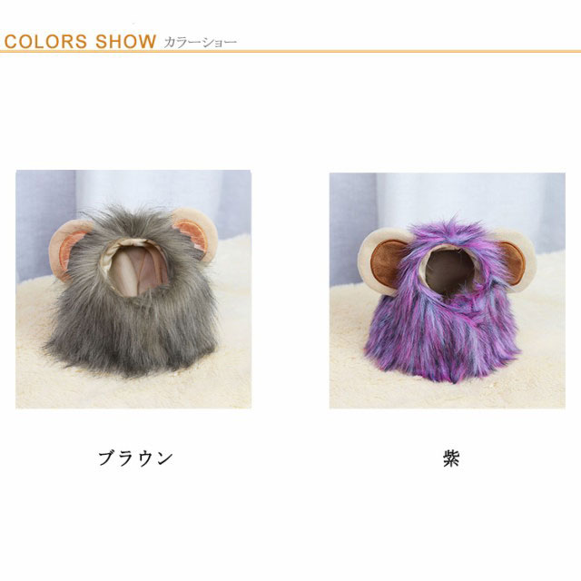 | 愛犬に被せると可愛いライオンさんに大変身! あご部分にマジックテープを留めるだけであっという間にライオンに大変身! ワンちゃんの頭サイズに合わせてしっかりフィットします。 柔らかく暖かい生地を使用しており、ペットの外出用帽子やウォーマーとしてもオススメです。 毛をつまむように逆立てると、ライオンらしさが強調されます。 汚れになっても水洗い可能なので、長くご使用いただけます。 | |