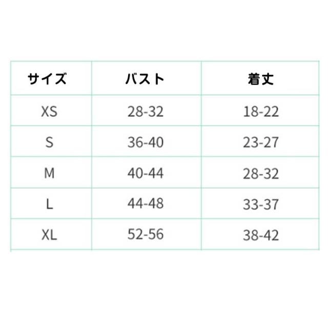 | サイズについての説明 | XS:胸囲28-32CM 背中の長さ18-22CM 推奨体重1.5 kg S:胸囲36-40CM 背中の長さ23-27CM 推奨体重2-3 kg M:胸囲40-44CM 背中の長さ28-32CM 推奨体重3-4.5 kg L:胸囲44-48CM 背中の長さ33-37CM 推奨体重4.5-6 kg XL:胸囲52-56CM 背中の長さ38-42CM 推奨体重6-8 kg ※秋冬向き:厚みのある洋服はワンちゃんのヌードサイズよりもゆとりをもってお選びください。 |