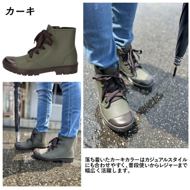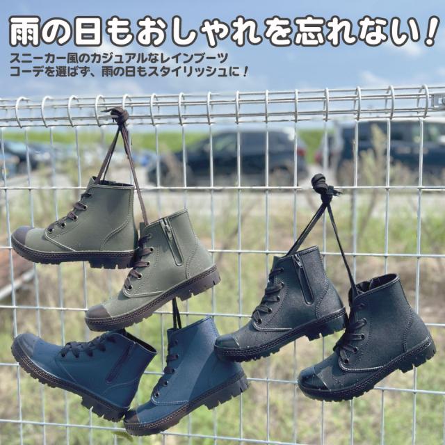 | 雨の日も気分アップ!かわいいデザインのレインブーツ! 防水仕様のハイカットレインシューズが登場。 スニーカー風のカジュアルなデザインで普段のコーディネートにも合わせやすく、雨の日もおしゃれに決まります。 凹凸加工を施した滑りにくい靴底と軽量設計で、安定した歩行をサポート。 止水ファスナーを採用し水の侵入を抑えつつ、快適な履き心地を実現しました。 ブラック、ネイビー、カーキの3色展開で自分のスタイルに合った色が選べます。 デイリーからアウトドアまで幅広く活躍する一足です。 |