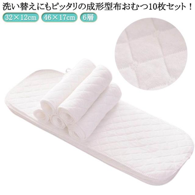 おむつライナー エコ育児 46×17cm 成形布おむつ 6層 綿 赤ちゃん用 10枚セット 布オムツ 新生児 成形布おむつ 洗える 吸収性抜群 32×12cm ベビー用品 保育園 入園準備
