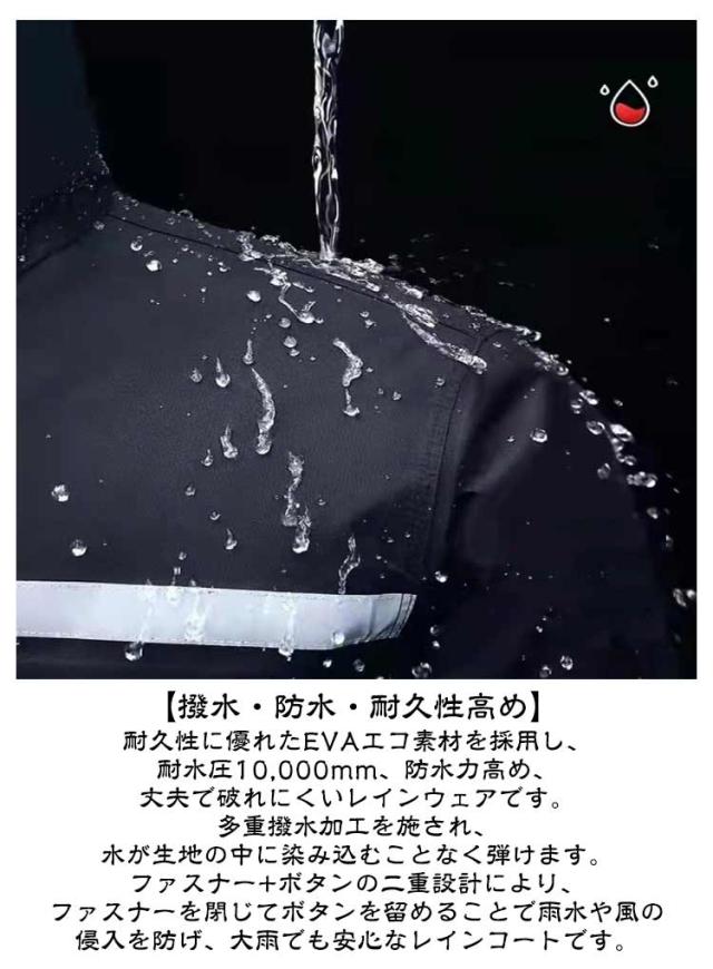 | 【反射帯・ポケット付き】 反射テープがあり、夜道や雨で視界が悪い時でも安心安全にご利用いただけます。ジャケット両サイドには大容量のフラップ付きポケットを配置し、利便性も確保しています。 【男女兼用レインウェア】 ビジネスや通学などに使いやすいタイプで街歩きだけでなく、自転車、バイクなどにも対応可能なレインウェアです。 革新的な収納式フードと着脱式バイザートップによって、雨の日の自転車運転も驚くほど安全・快適。レインウェアは上下とも、裏地全体にメッシュ素材を使用しており蒸れやベタつきを防止します!日常の通勤・通学・お出かけになどにピッタリの、街で暮らすすべての人に安全・快適を提供する一着です。 【撥水・防水・耐久性高め】 耐久性に優れたEVAエコ素材を採用し、耐水圧10,000mm、防水力高め、丈夫で破れにくいレインウェアです。多重撥水加工を施され、水が生地の中に染み込むことなく弾けます。ファスナー+ボタンの二重設計により、ファスナーを閉じてボタンを留めることで雨水や風の侵入を防げ、大雨でも安心なレインコートです。 | |